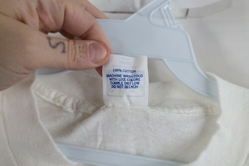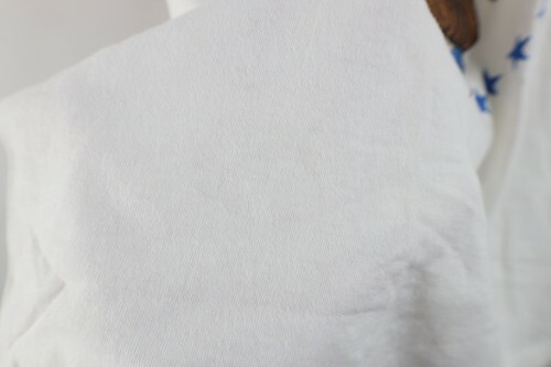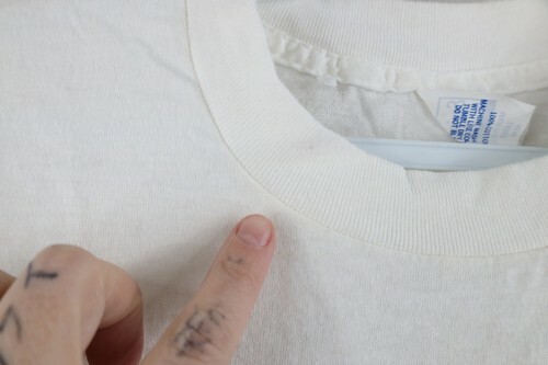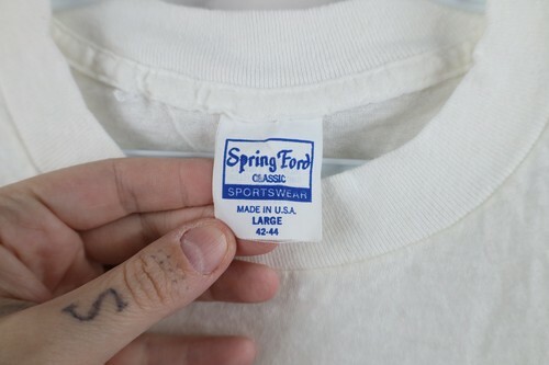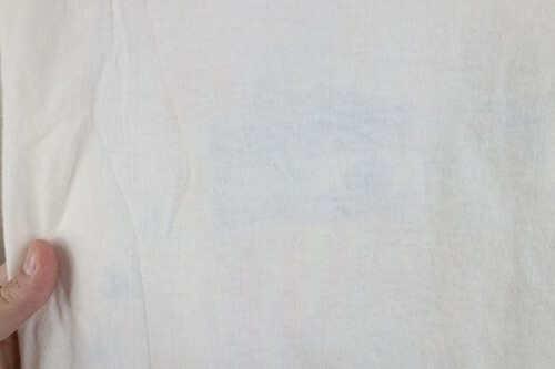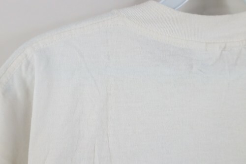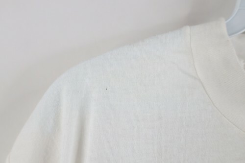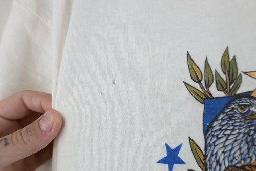 Holes front top right. Blemish collar. Dark spots front, back. Loose thread bottom hem. Collar, armpits discolored. Yellowed. Graphics faded. Pilling. Made in USA