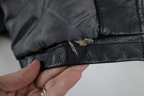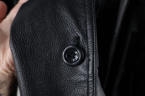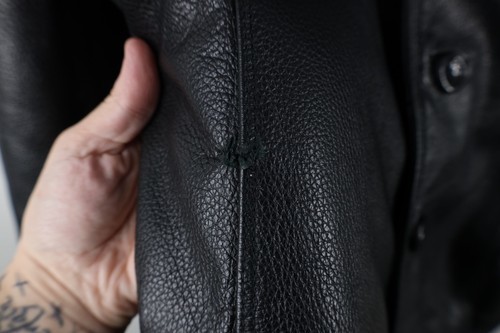 Cut on front bottom right. Buttons loose. Blemishes on back. Inner cuffs discolored. Distressed and faded