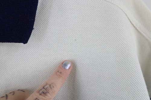 Hole to the left of the collar. Blemishes front top and middle. Has pilling on collar, bottom, cuffs. Color faded