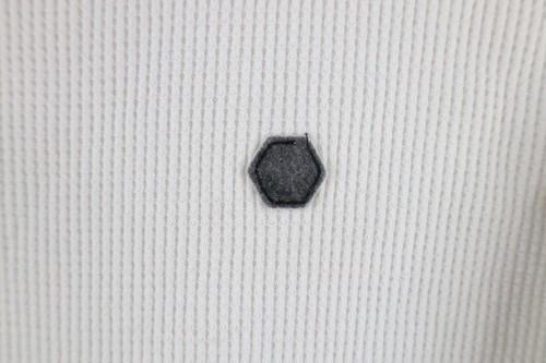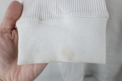 Cuffs blemished. Stains on sleeves. Logo on chest distressed