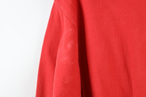 Stain front middle, bottom back right. Missing hoodie string. Color faded. Blemish on the back left sleeve.
