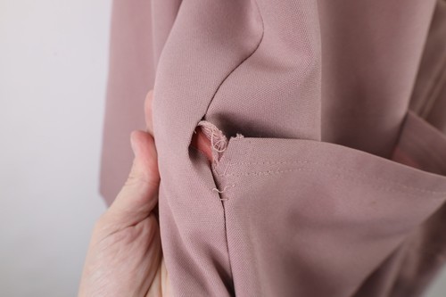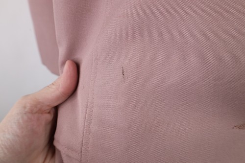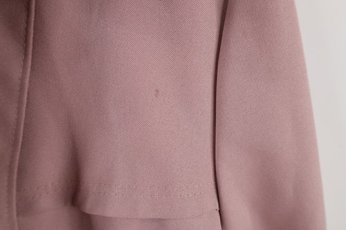Hole right hand pocket side seam. Holes and blemishes in lining. Collar discolored. Blemishes front, back, sleeves, and cuffs. Color fade. USA made