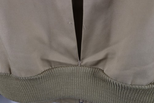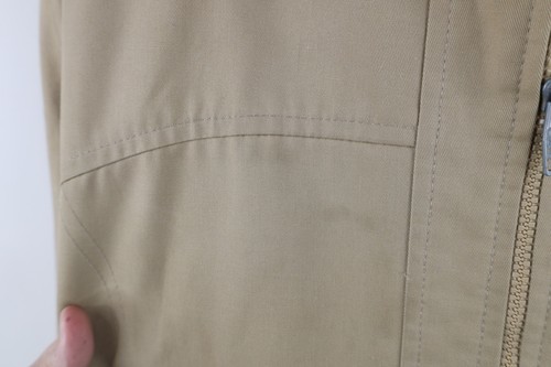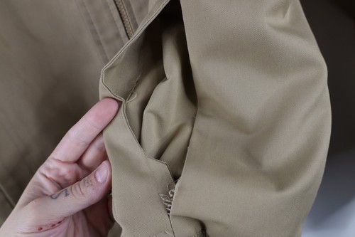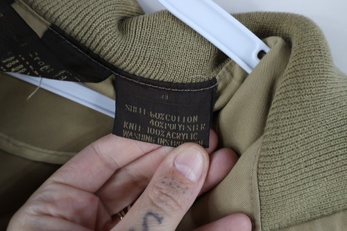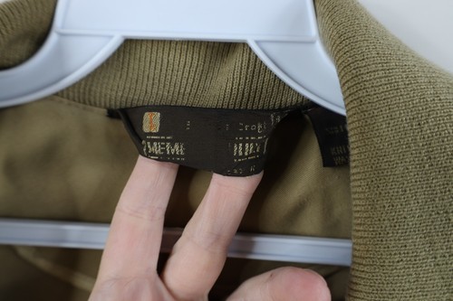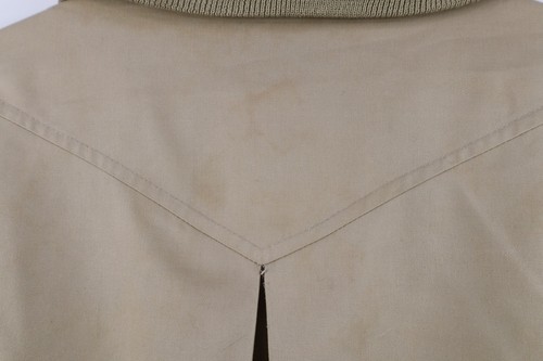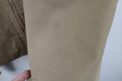 Stains/dark spots throughout. Hole pockets. Ripped seams pocket corners, back. Collar, cuffs discolored/pilled. Color faded. Tag faded