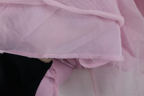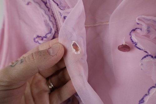 Buttons holes distressed. Blemishes front top, back bottom. Ripped seams along bottom hem. Color faded
