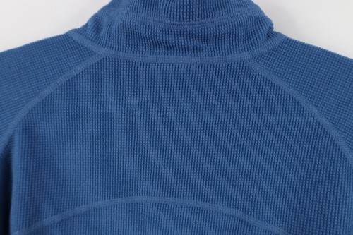 Blemishes back top. Collar, arms/cuffs discolored. Color faded. Pilling