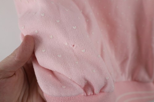 Blemishes front and sleeves. Hole front bottom and back bottom. Pilled