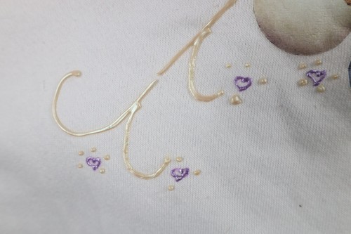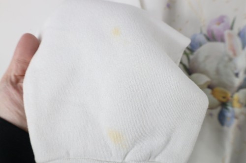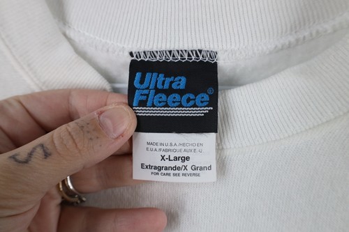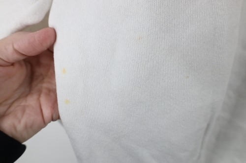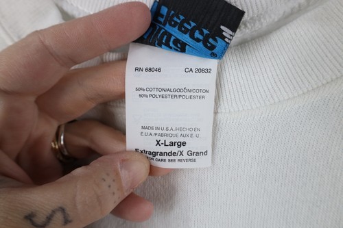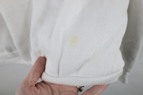 Stains front, arms, back. Has pilling. Graphics faded. USA made