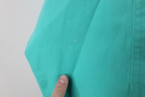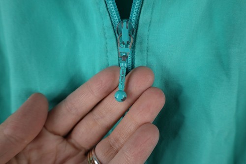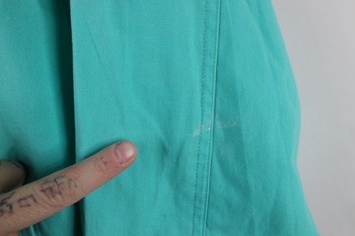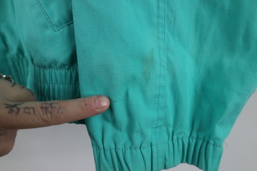Cuffs and bottom stretched out. Stains throughout. Color faded. Zipper tarnished