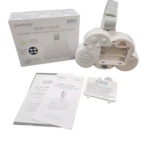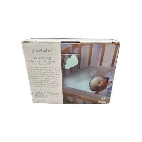 Introducing the Pure Enrichment Baby Cloud Portable Sound Machine Night Light Color Change NIB! This amazing product is perfect for your little one's bedtime routine. The sound machine features a soft and soothing sound that helps babies fall asleep easily. The multicolor night light adds a touch of whimsy to the room.