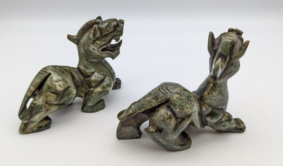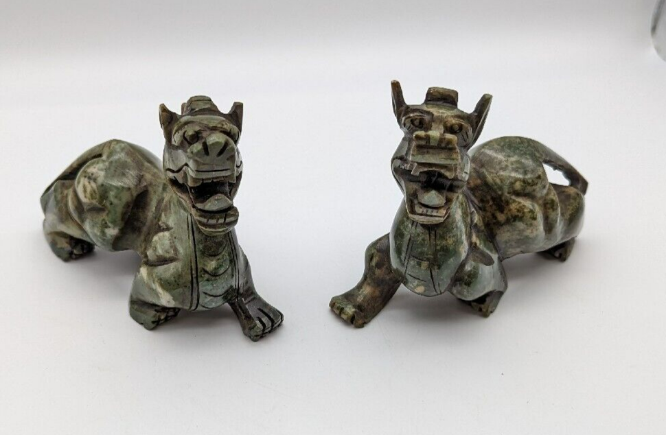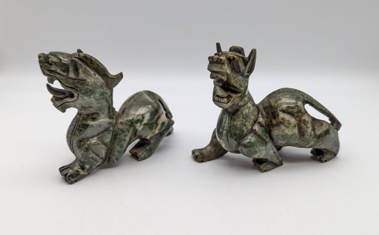 Vtg Set of 2 Jade Green Carved Foo Dogs Prosperity Dragon Heavy Good Fortune