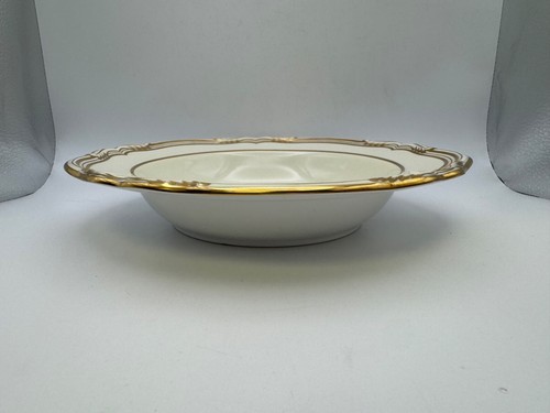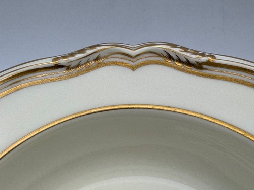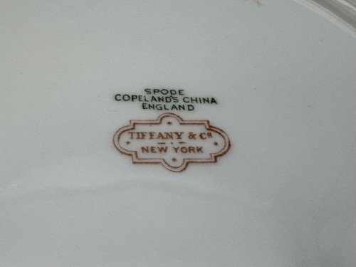 This is the cream color variety of the Spode Sheffield pattern. The front is cream color while the back is white. The bowls have a Tiffany Co. retail mark. They measure 8 3/4" in diameter and 1 5/8" in height and are in very good estate condition with no chips, cracks, or excess wear.