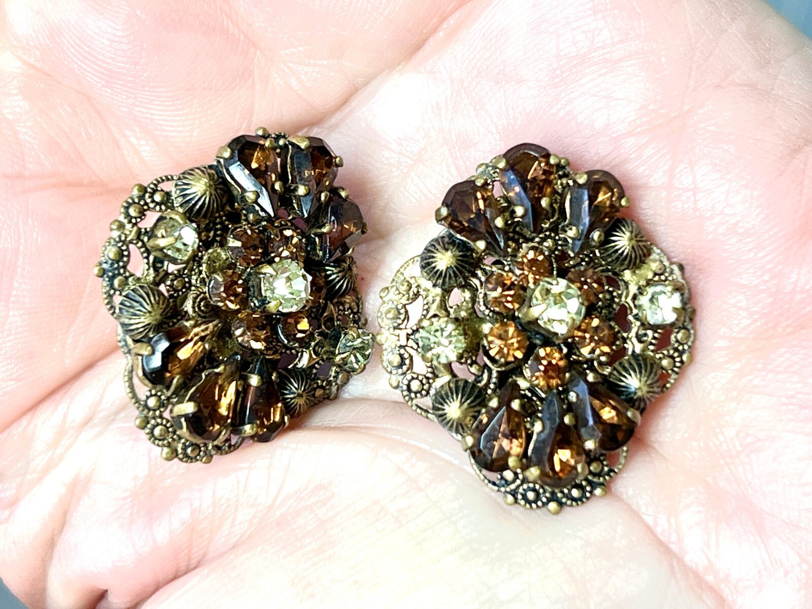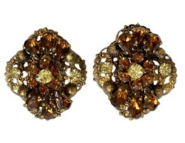 Brass-colored filigree 1 1/8? x 1 1/4? clip-on earrings with prong-set yellow and light and dark amber stones.In a bronze filigree setting, a bit like Haskell. Excellent condition.