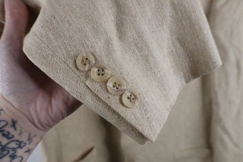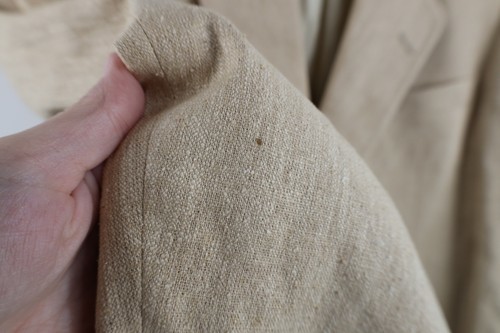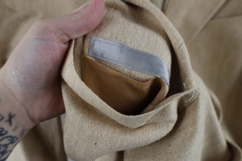Stains front, right arm, inner lining. Dark spots, pilling. Collar, cuffs, inner lining discolored. Color faded. Made in USA