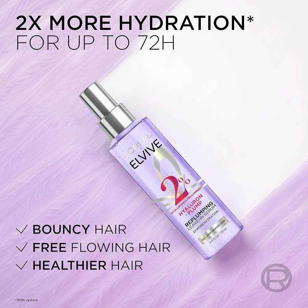 Hydrating Routine for Dry and Dehydrated Hair: Gently cleanse with paraben-free Elvive Shampoo, prime with Flash Hydration Wonder Water, then apply hair conditioner to detangle and moisturize. Finish with Replumping Serum to revitalize hair