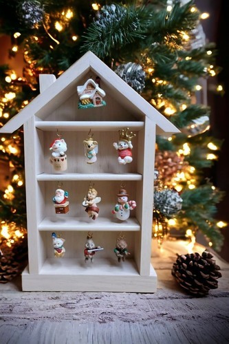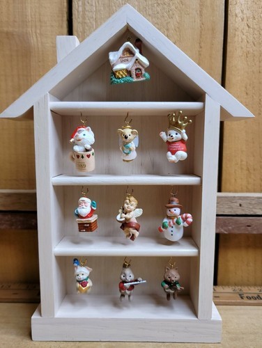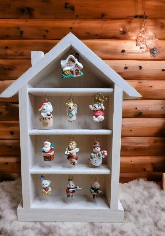 This is a vintage Hallmark Shadow Box Memory House that comes with 10 beautiful miniature keepsake ornaments. The set includes a mix of abstract designs like snowman, Santa, and a house shape. These ornaments are artist designed and customizable to suit your preferences. This Hallmark Keepsake Miniature's Ornaments set is a perfect gift for Christmas occasion and for anyone. The set comes with an 11-inch tall wooden house-shaped shadow box that can hold all these ornaments beautifully. Get your hands on this collectible now!