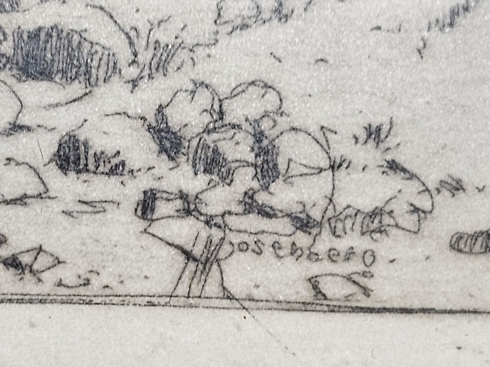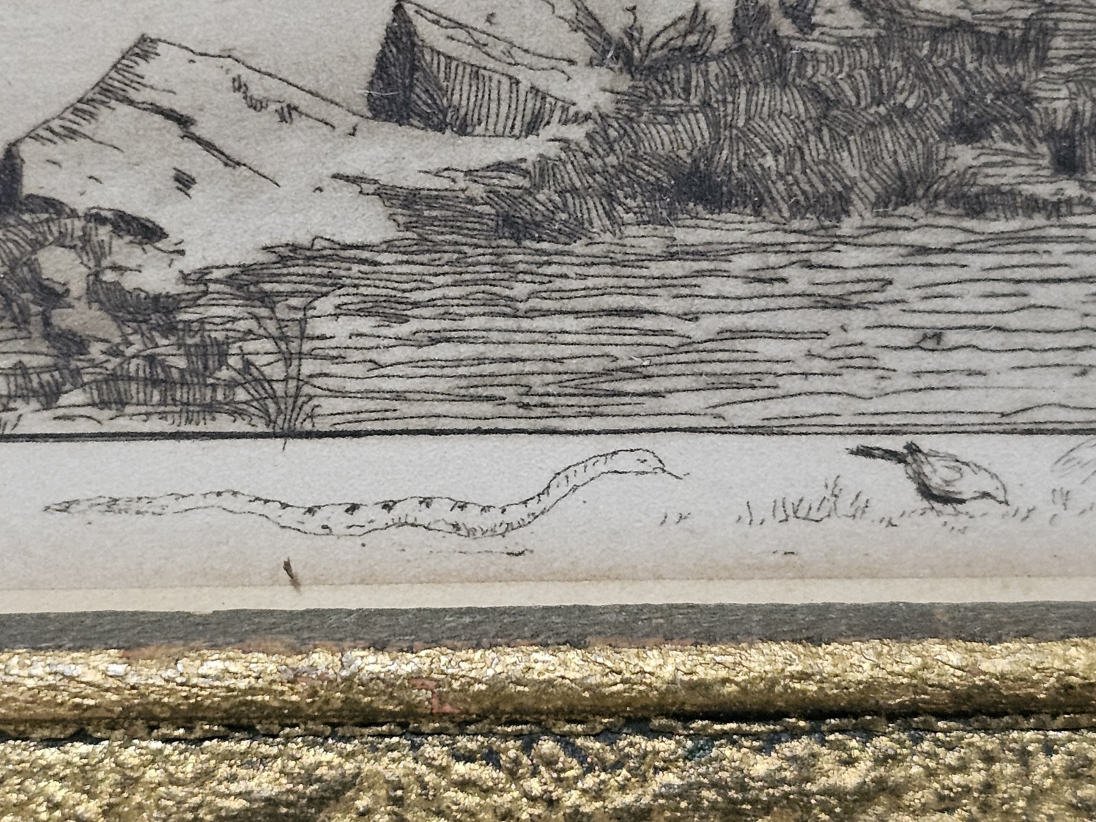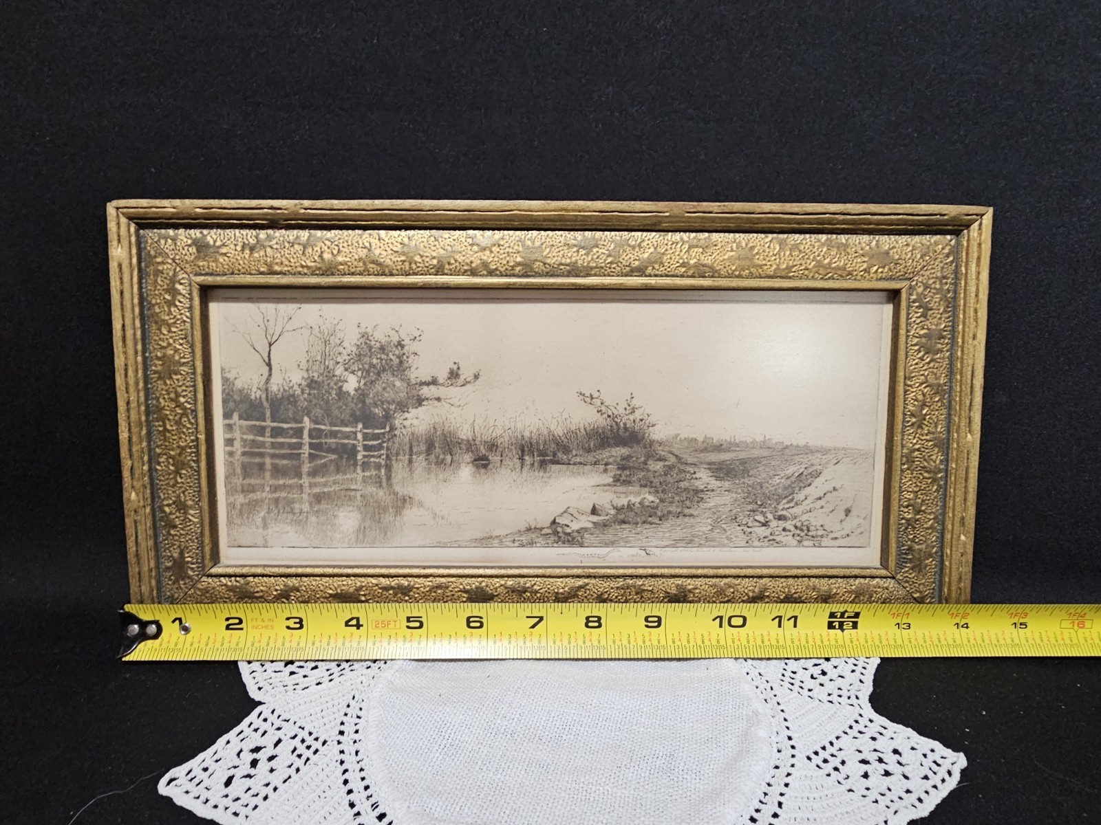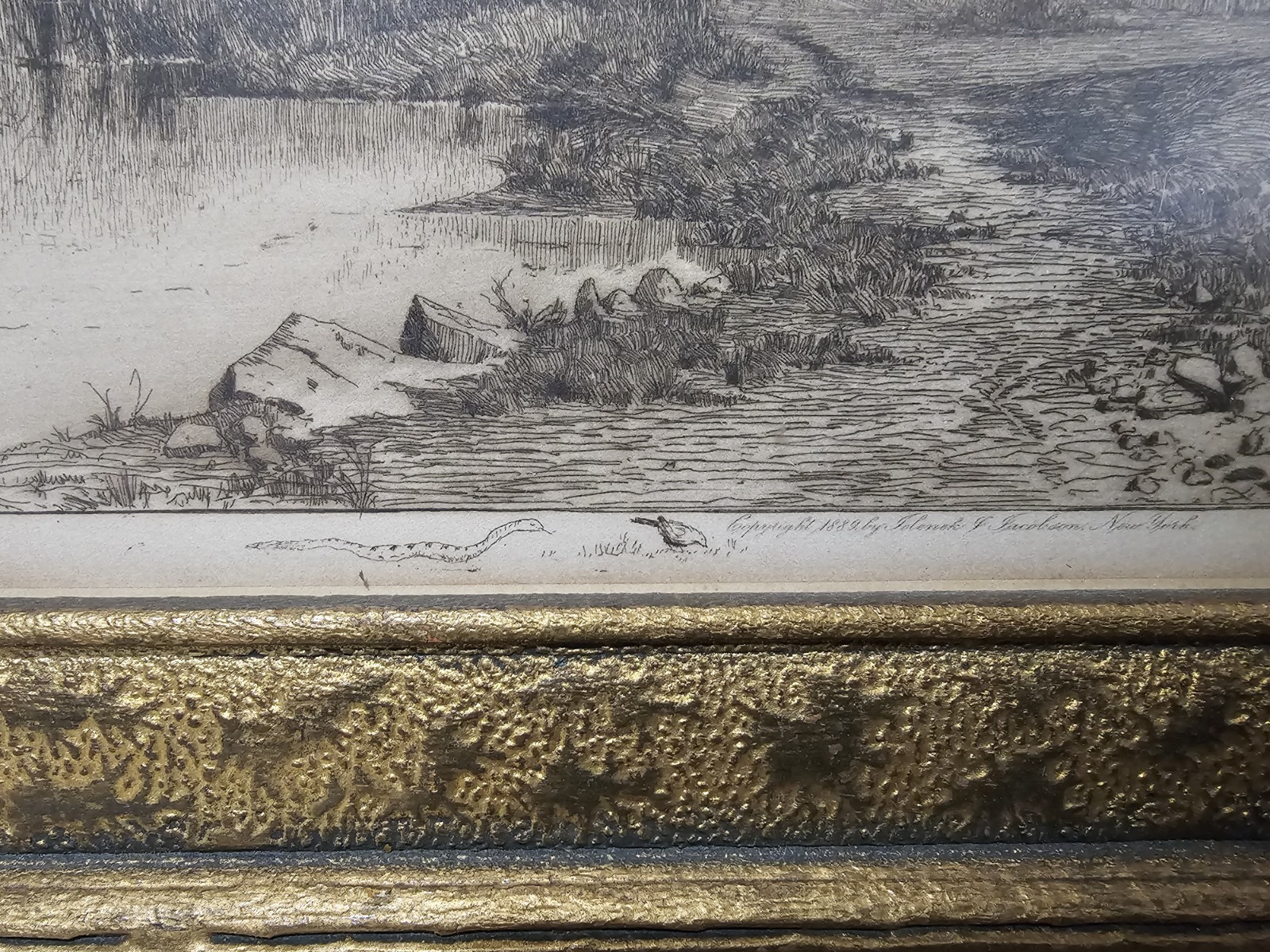 Beautiful antique monochromatic etching signed in plate by I.M. Rosenberg, dated 1889 and published by Jelenek J. Jacobson, New York. This monochromatic landscape print features an intricately detailed riverbank scene with tall grasses, trees, and a wooden fence. At the bottom, a subtle yet striking moment is captured?a snake slithers through the grass while a bird, possibly a crow, watches nearby, I believe this to be a trademark of the Jelenek J. Jacobson Printing Company.