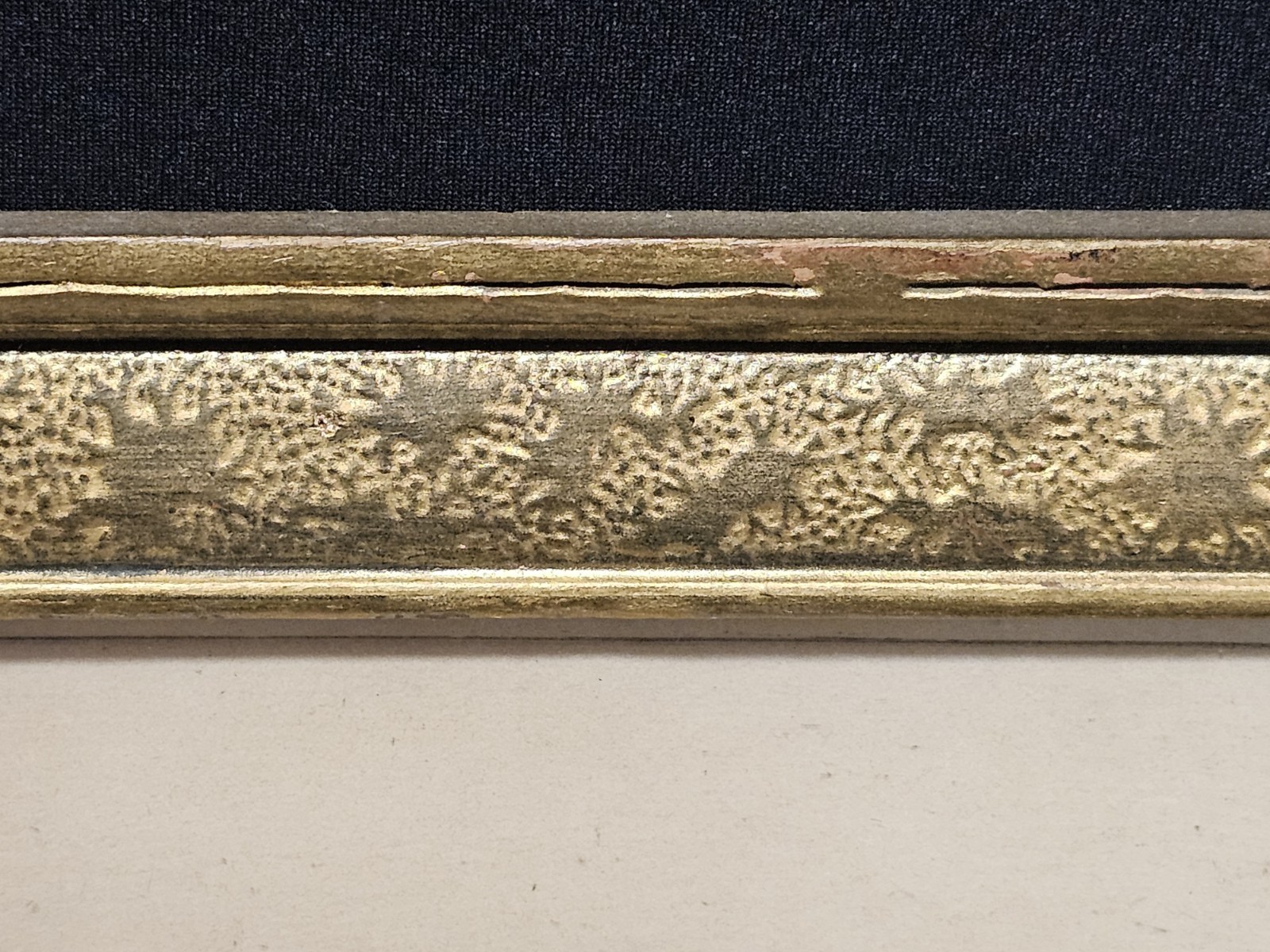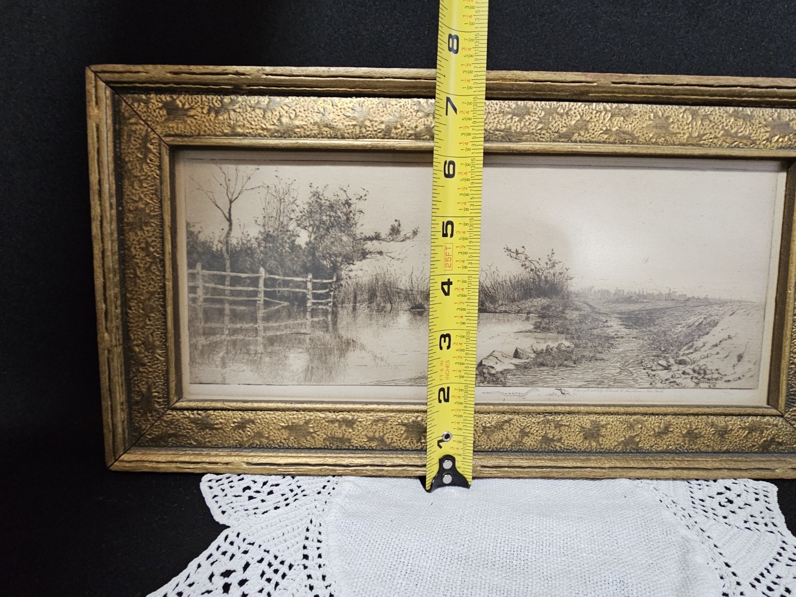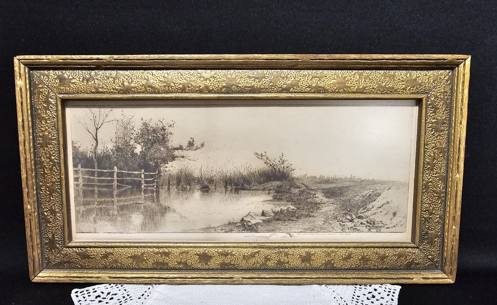 They are usually monochromatic etchings or photogravures, often with rural, architectural, or river scenes, and often come in highly ornate frames as this one does.