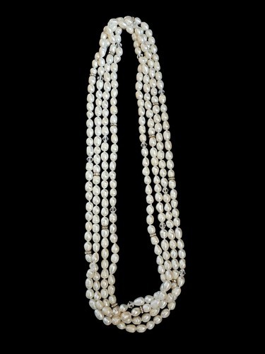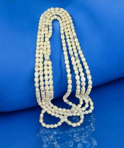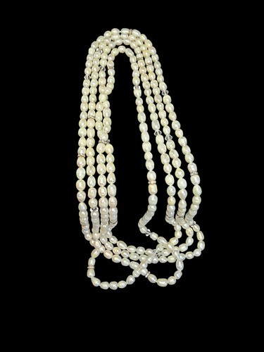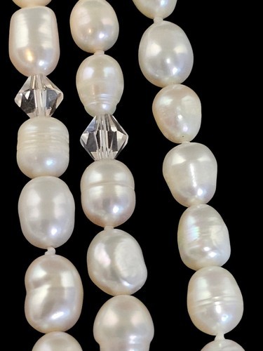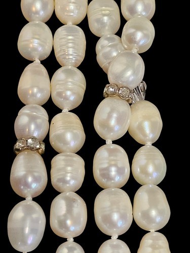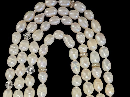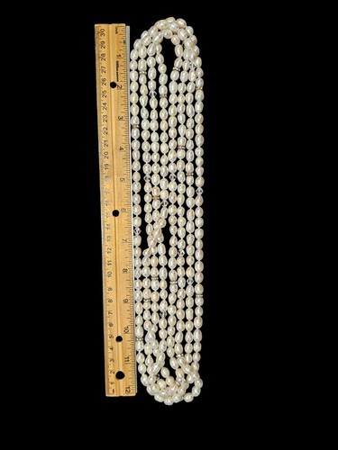 Add a touch of elegance to your outfit with this vintage 102" necklace. The necklace features hand-knotted freshwater pearls with crystal spacers, giving it a unique and sophisticated look, making it perfect for any formal or special occasion. The necklace has 6-7mm pearls and can be worn in so many different configurations--this is a must have for a lifetime of sophistication