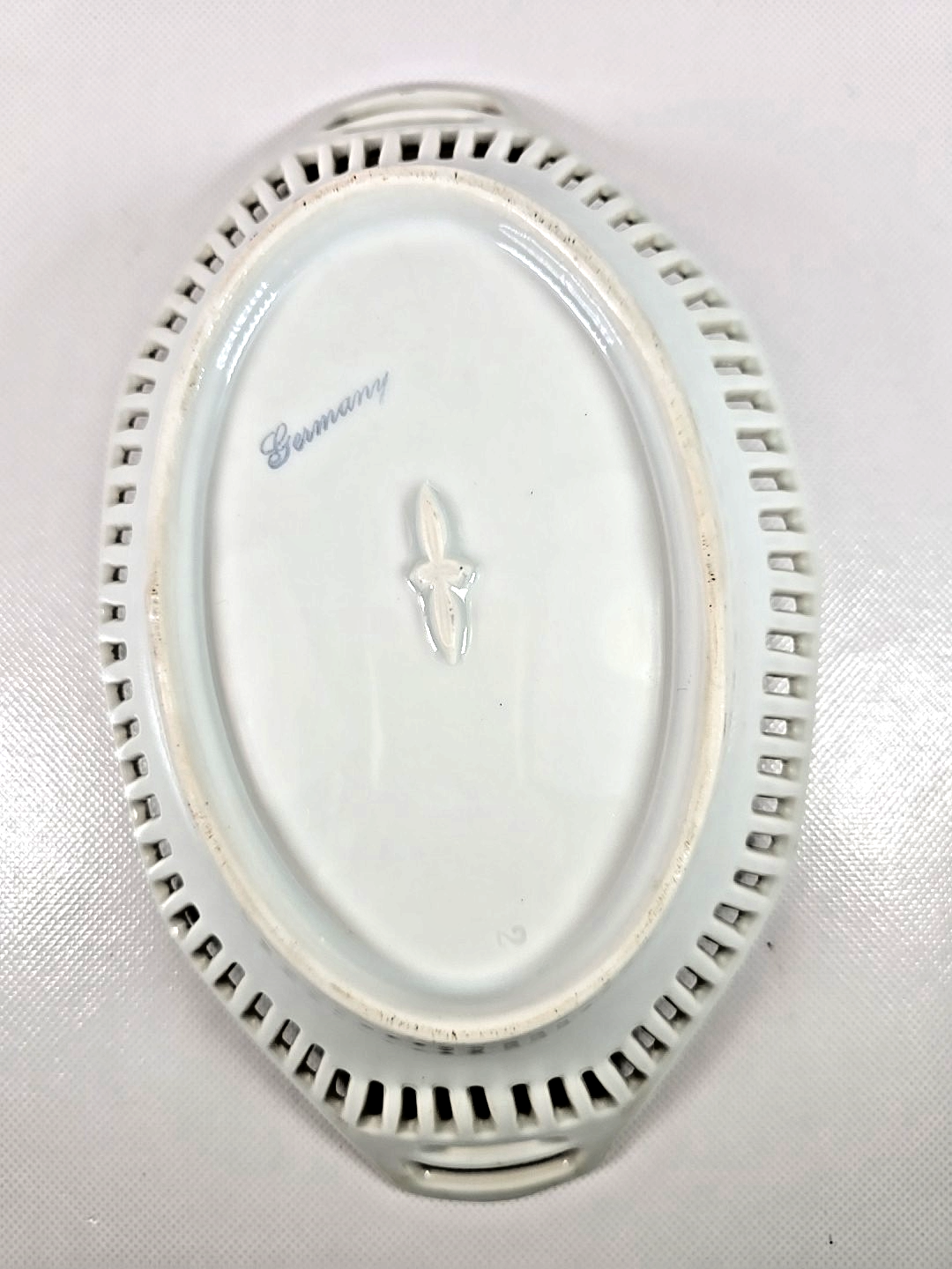German Reticulated Porcelain Dish White Gold Trim Handles 9.5x6” Vintage Germany
