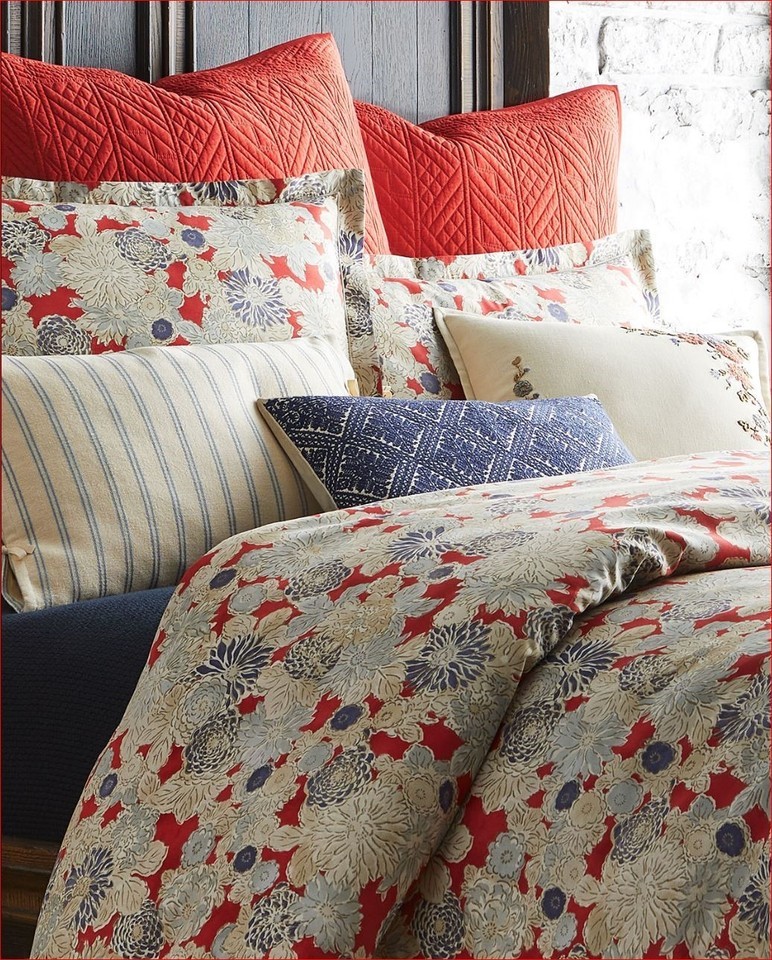 - modern take on a vintage floral pattern, highlighting a vibrant palette of warm reds and slate blues. It's made from a silk cotton sateen for a smooth hand and showcases expert construction.