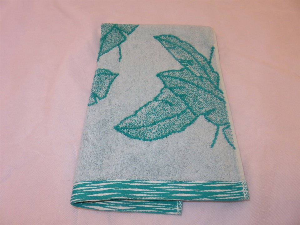 adorned with a jacquard motif of floating leaves in a rich turquoise tone. Set against a light blue background of soft organic terry cloth, pattern resembles free falling feathers