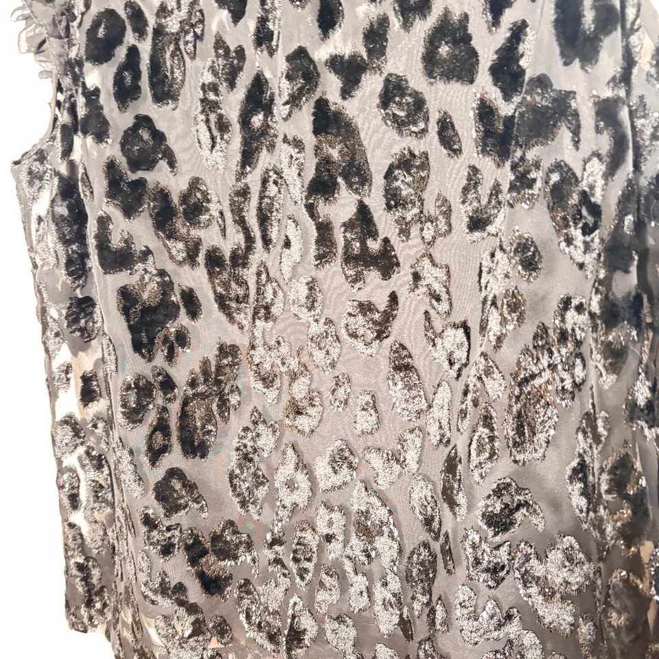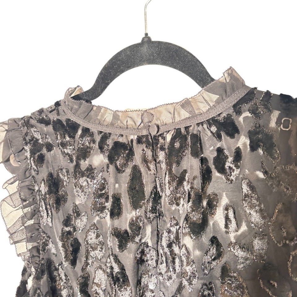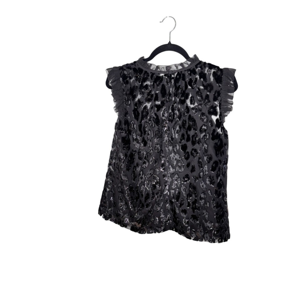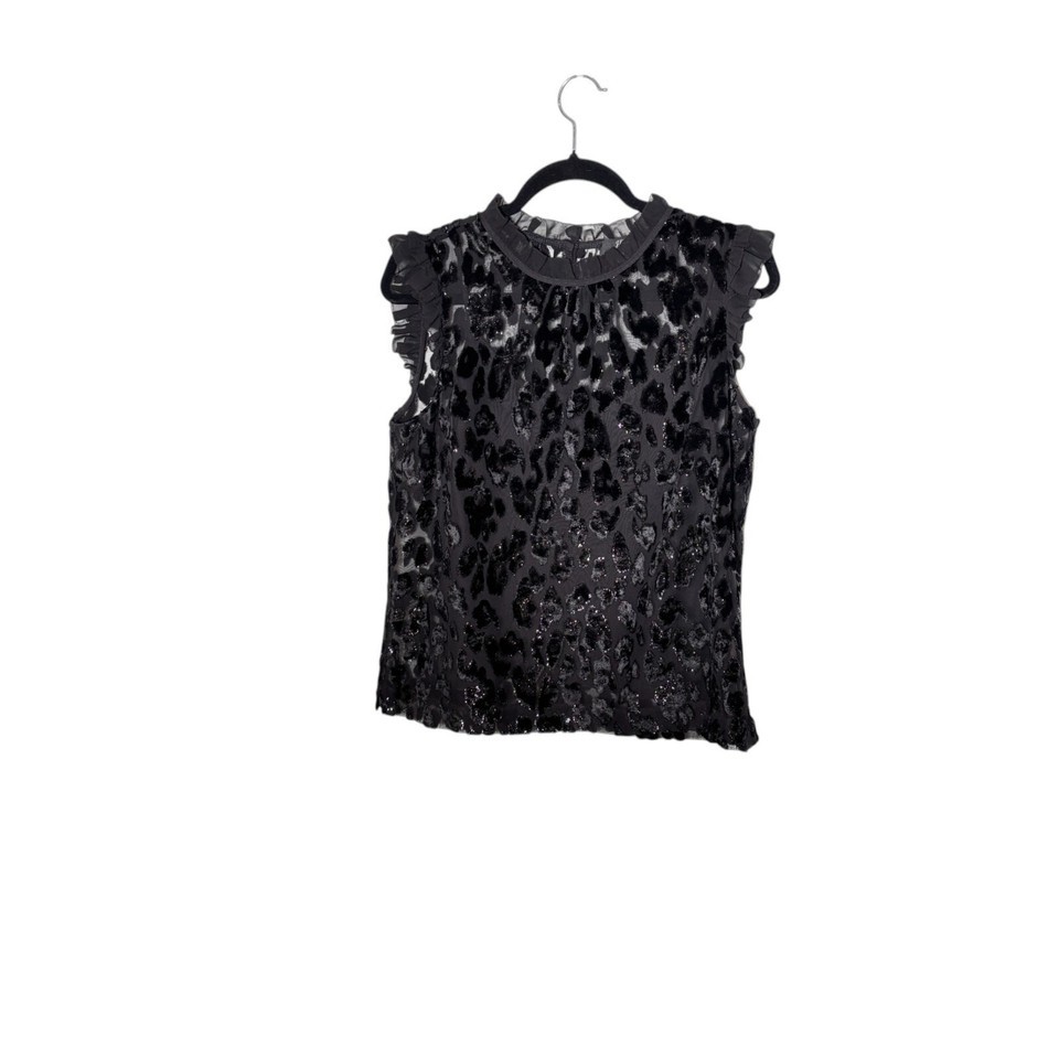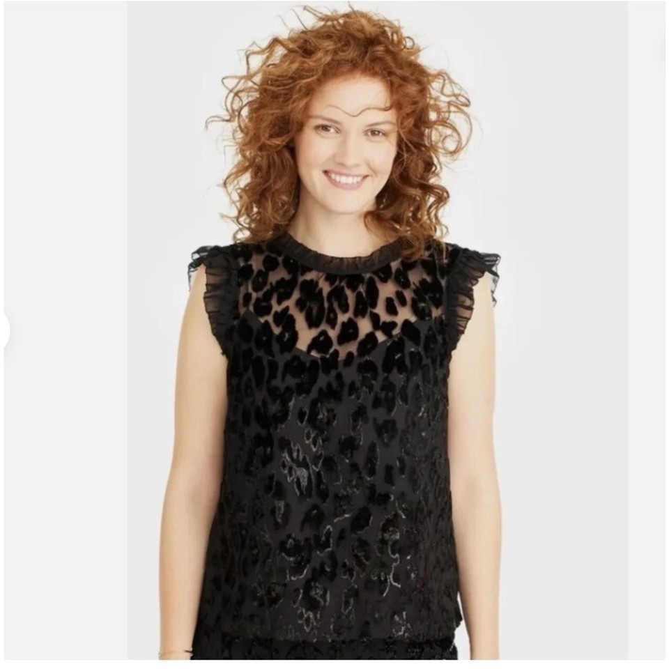 Embrace your wild side with the J.Crew Black Velvet Burnout Top, a perfect blend of edgy and elegant. This high-neck blouse, features a sophisticated ruffle accent and a sheer leopard print that adds a touch of the exotic to your wardrobe. The sleeveless design makes it an ideal choice for layering or for those warm, summer nights. Crafted with attention to detail, this blouse boasts a smooth button closure and is made to fit comfortably with a regular size type. Whether you're dressing up for a night out or adding some flair to your day-to-day look, this top is a versatile addition to any fashion-forward collection.