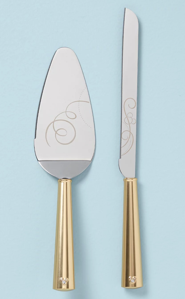 Lenox Disney Bridal Dessert Cake Knife & Server 2 PC. Gold Handle Mickey Gem New