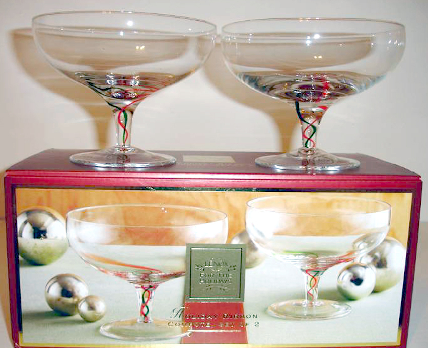 Lenox Holiday Ribbon Stemmed Dessert Bowl/Compote Crystal Glasses Pair 6"W New