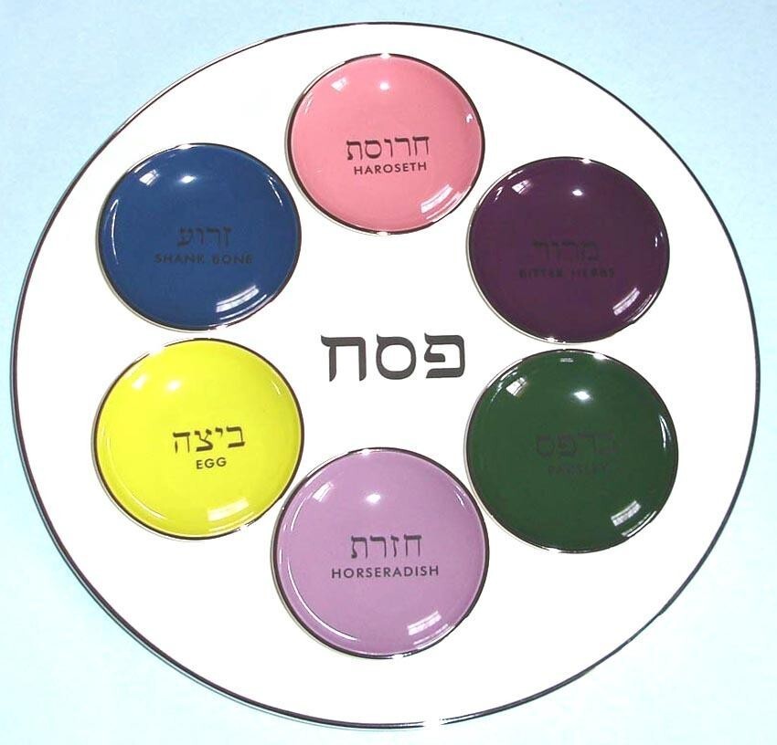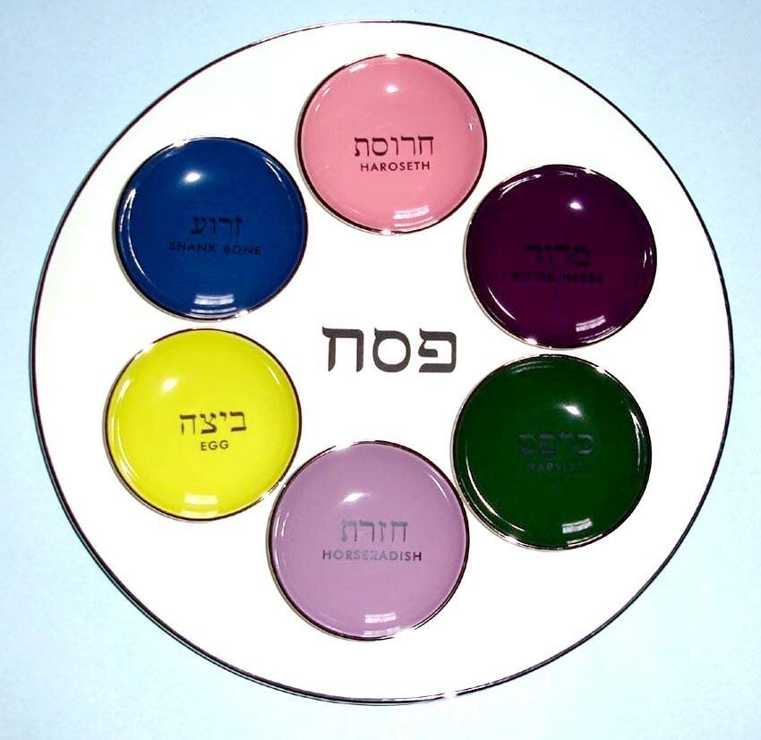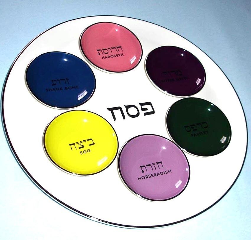 modern-style seder plate with 6 colorful bowls which