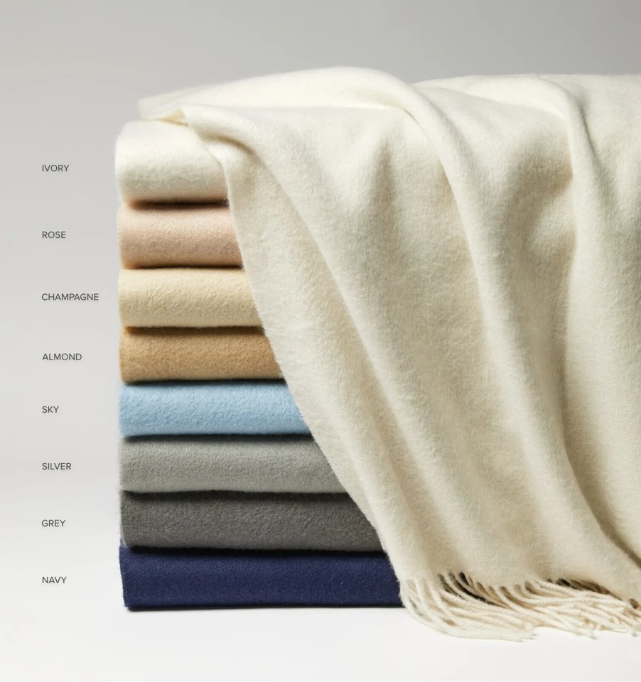 Delicate and dappled, like sunshine on water, our pure cashmere throw is napped with a fine downy watermark wave and finished with a flounce of fringe.