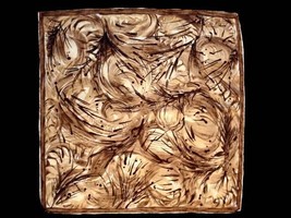 Exceptional "Rhodia" acetate scarf measures 26 oe? x 26 oe? and features an abstract design in shades of brown on a dark cream background. It has a hand-rolled hem and is in excellent condition.