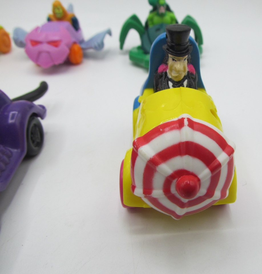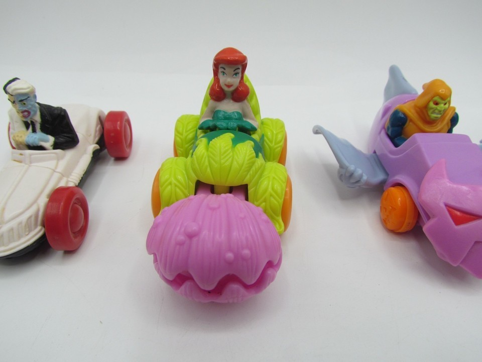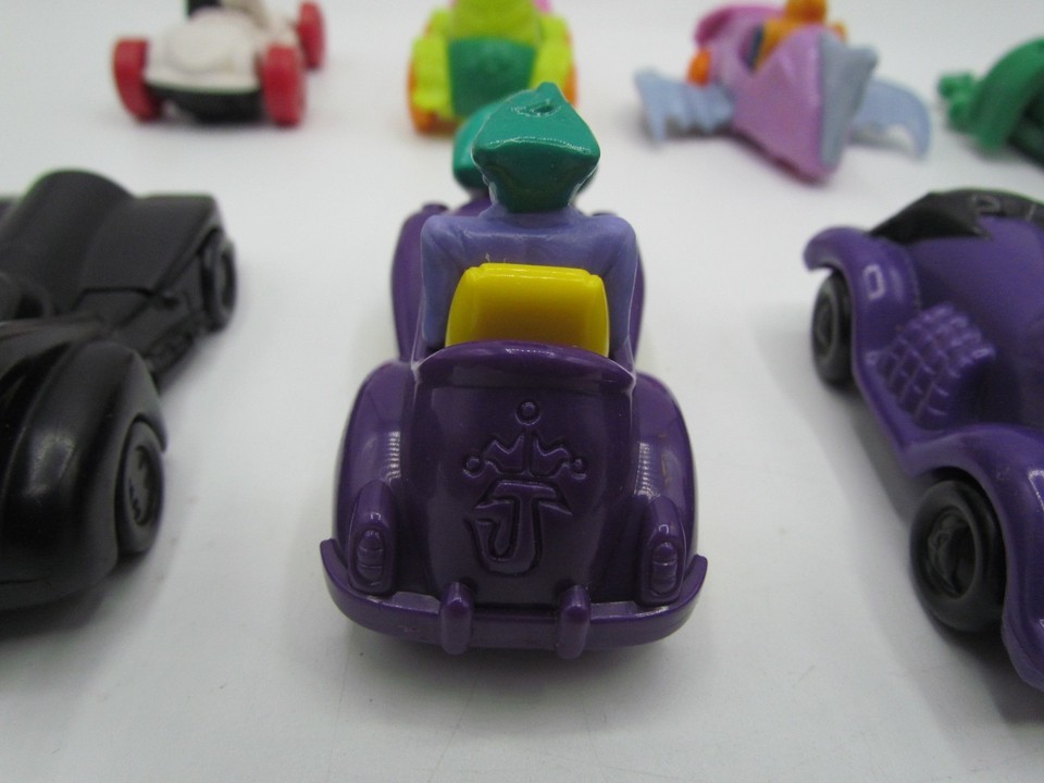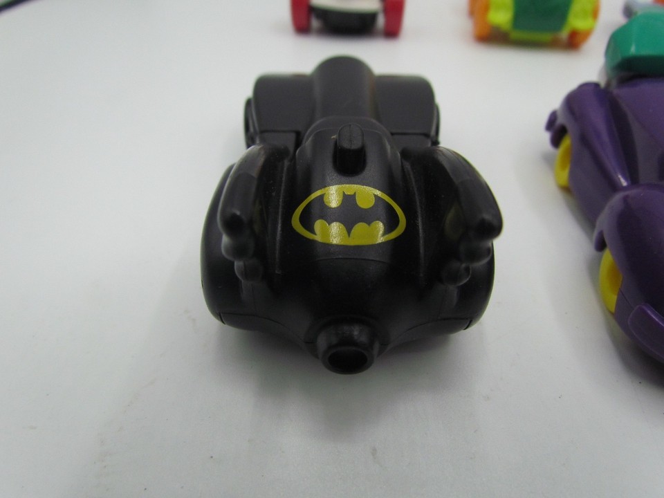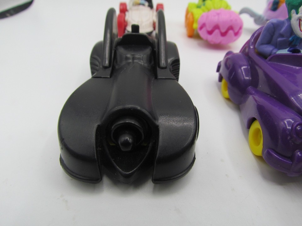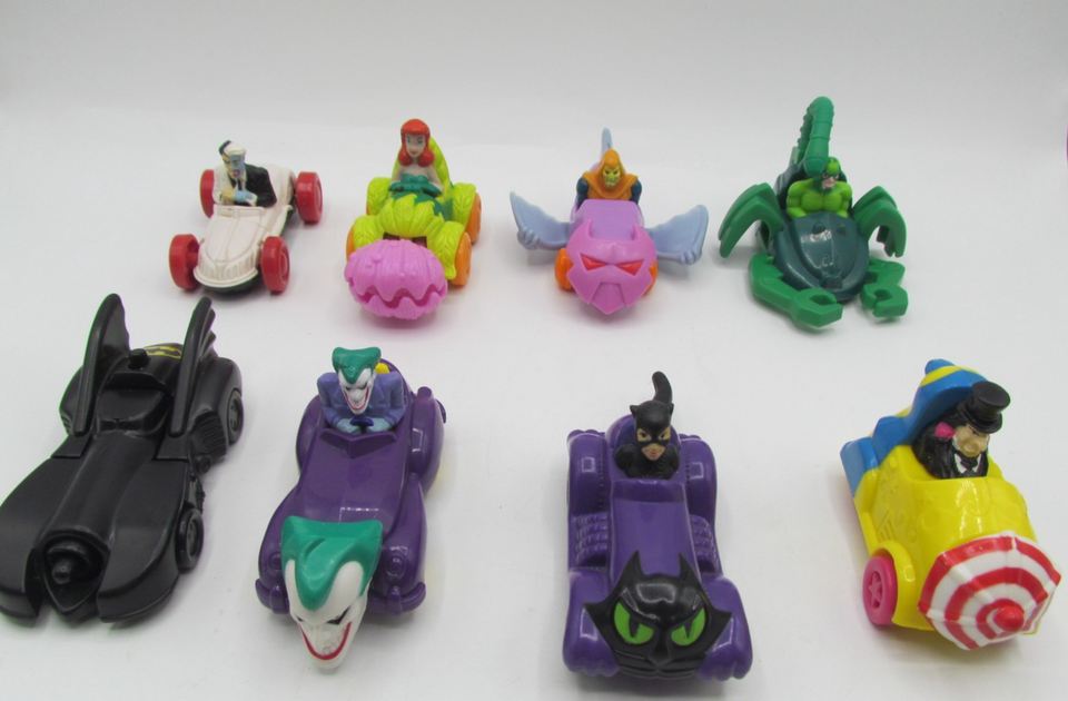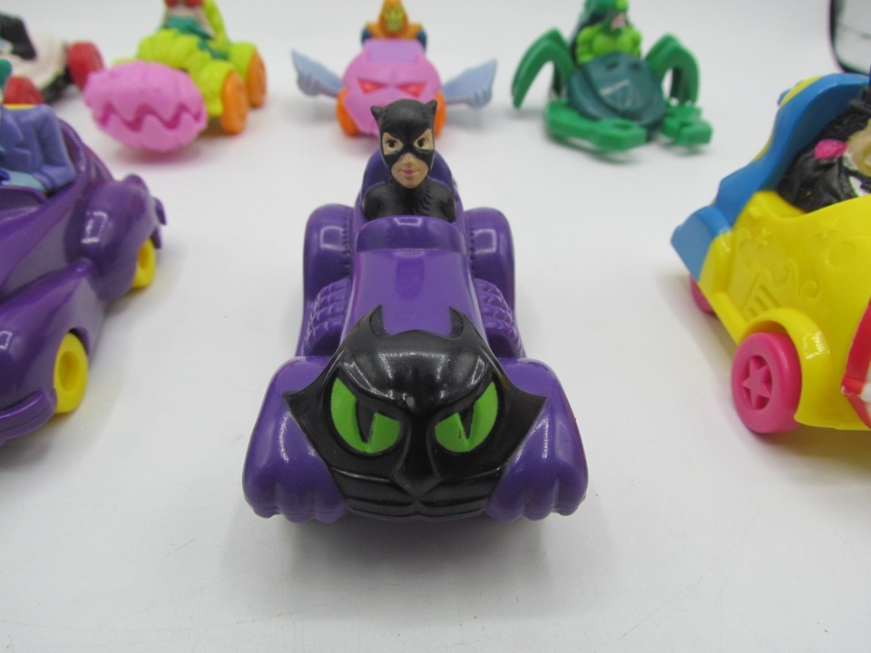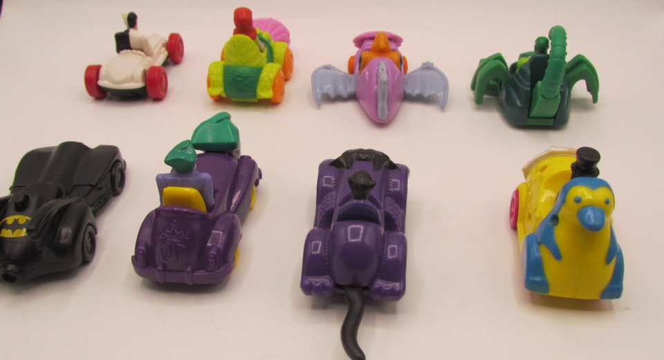 This lot of 8 McDonald's DC Comics Marvel toys features vintage vehicles from the Happy Meal series, with characters from the Batman franchise. Created in collaboration with DC Comics, these toys are a nostalgic collectible for fans of both fast food chains and superheroes. Perfect for collectors or kids looking to add some fun and excitement to their McDonald's meals, this lot offers a unique opportunity to own a piece of fast food history.