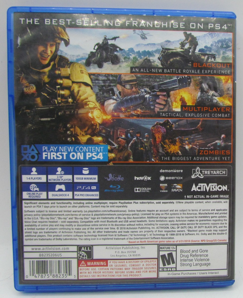 The product is the Call of Duty: Black Ops 4 video game for the Sony PlayStation 4 console. Published by Activision, this game falls under the genres of shooter, war, and action adventure with a mature rating. Despite not including the manual, the game offers fast shipping and is in clean condition, providing an immersive and exciting gaming experience for fans of the Call of Duty franchise.