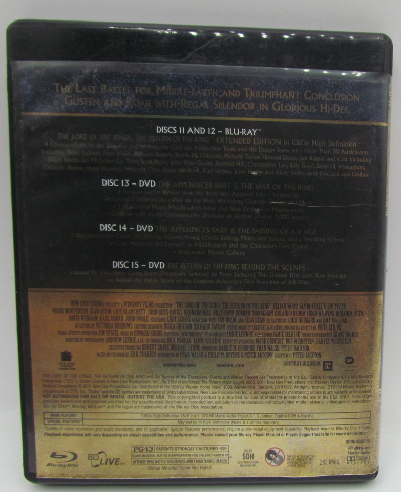 "The Lord of the Rings: The Return of the King (Blu-ray, Extended Edition)" is a fantasy film directed by Peter Jackson and produced by Barrie M. Osborne, Fran Walsh, and Peter Jackson himself. It is the third installment in the Lord of the Rings trilogy, with a run time of 179 minutes. This Blu-ray edition, released in 2003 by New Line Home Video, includes an extended version of the film in English language. The movie is rated PG-13 and offers a captivating viewing experience for fans of the fantasy genre, allowing them to immerse themselves in the epic world created by J.R.R. Tolkien."