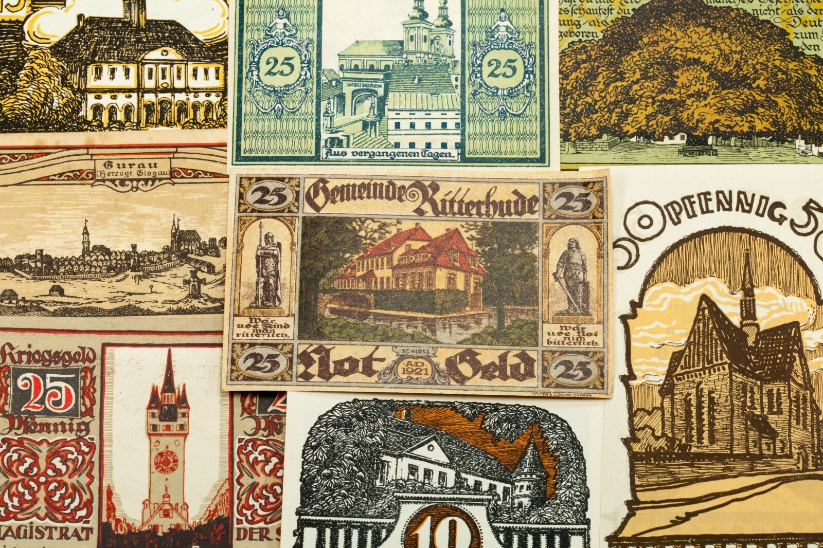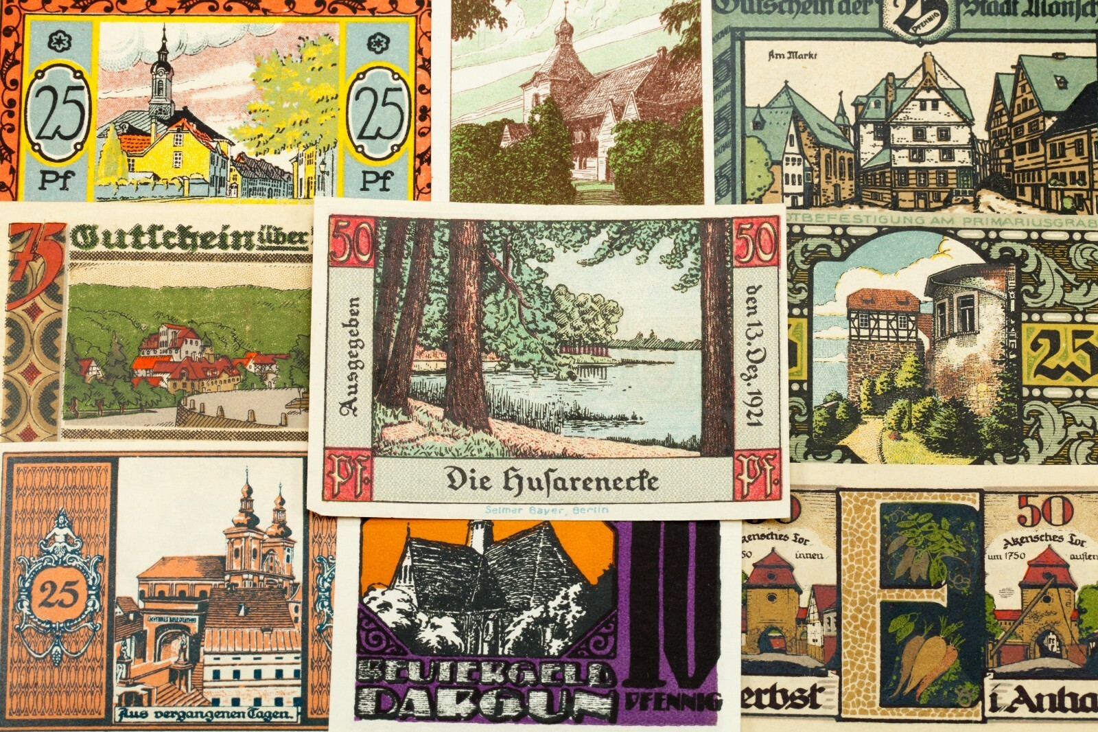 Les annees 1920, l'Allemagne Notgeld (Money d'urgence) 25pc - paysages, villes et scenes de rue