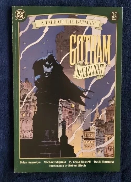 A TALE OF THE BATMAN: GOTHAM By GASLIGHT First Printing 1989 is a comic book featuring Batman (Bruce Wayne) in a standalone story set in the 19th century Gotham City. Written by Brian Augustyn and illustrated by Mike Mignola, it was published by Gaslight in 1989. The comic book is a softcover with color art and is boarded and bagged. It is the first printing and is intended for a general audience. It is a single unit and has issue number 1.