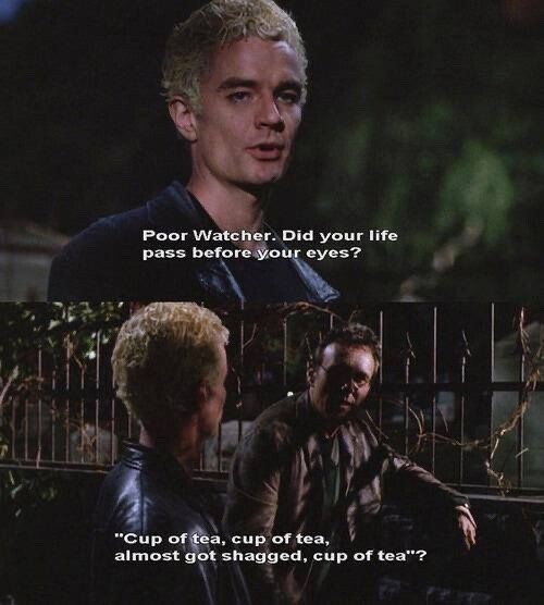 Spike: ?Oh, poor Watcher. Did your life pass before your eyes? Cuppa tea, cuppa tea, almost got shagged, cuppa tea.? ???