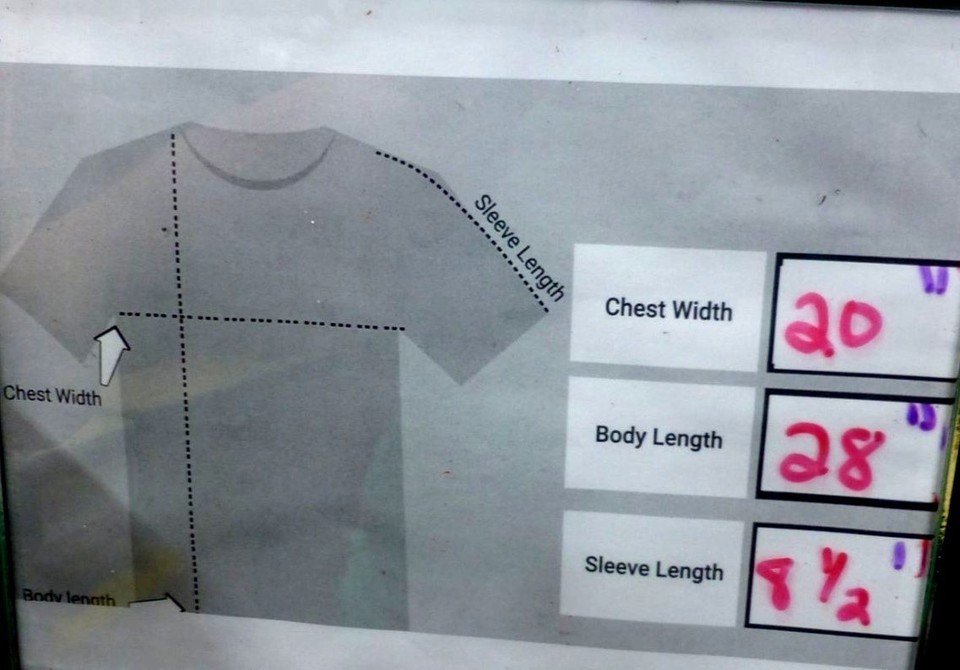 Chest width = 20 inches, Body length = 28 inches, Sleeve length = 8.5 inches