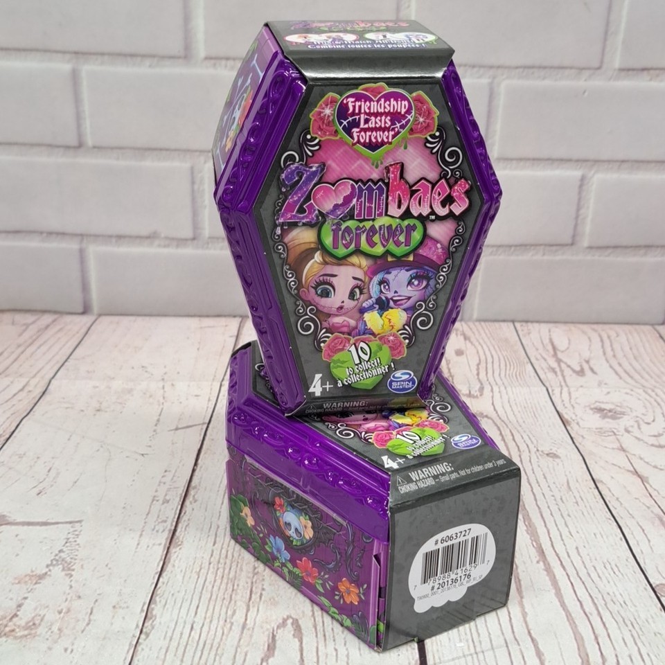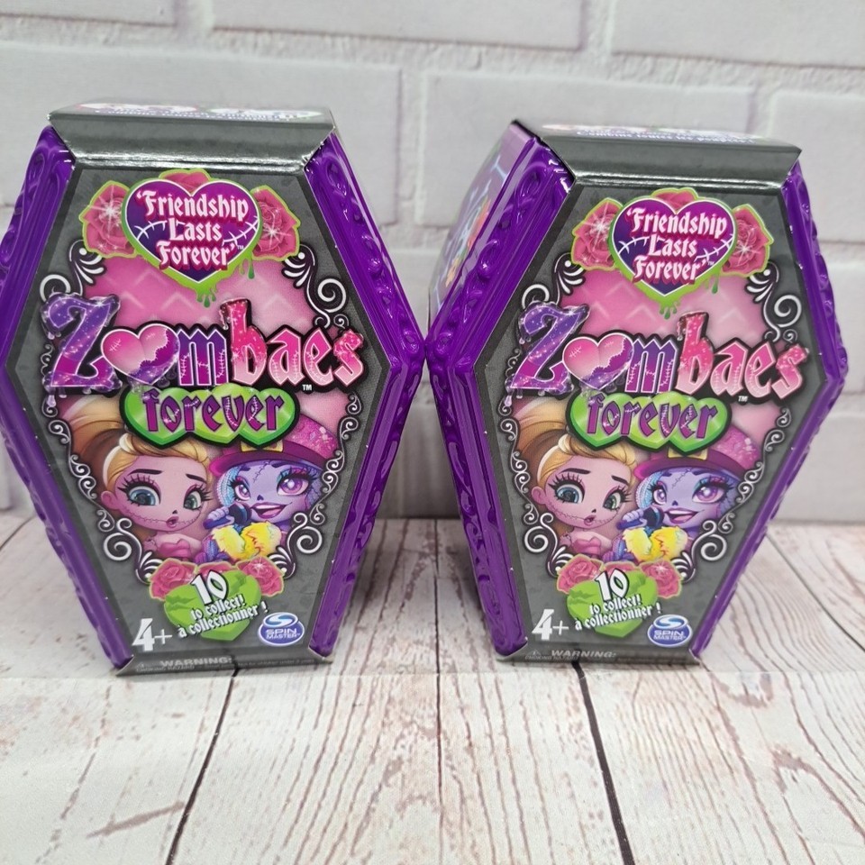 The Zombaes Forever Dolls Zombies Friendship Lasts Forever Coffin Blind Bags 2 pack features a set of 3" dolls from the Zombaes franchise. Each doll comes unopened in a coffin blind bag, making them a surprise for collectors and fans of the Zombaes series. This product offers a unique and fun way to add to your doll collection, with the added bonus of each set including a special doll from the Zombaes Forever product line.