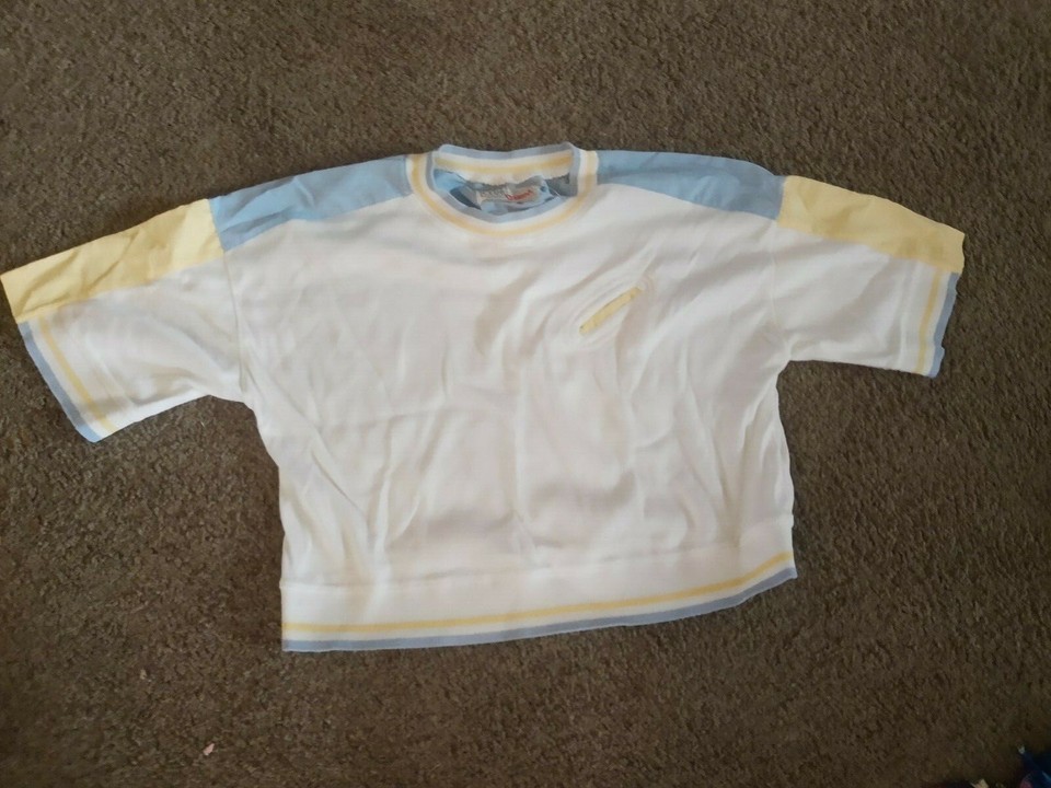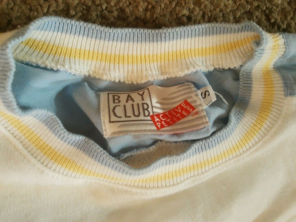 Deadstock Vintage 80's Bay Club Sweatshirt Crop top Short Sleeve White Blue Women's S This is nice crop top. Straight out of the 80's!! Literally. We got this from seized storage unit that had not been opened since 1990. Everything in this is old and from rich older single lady This seems a bit musty and may need washing. Measurements - 17 inches across the chest pit to pit 17 inches long 5 inches arm pit to cuff FREE SHIP