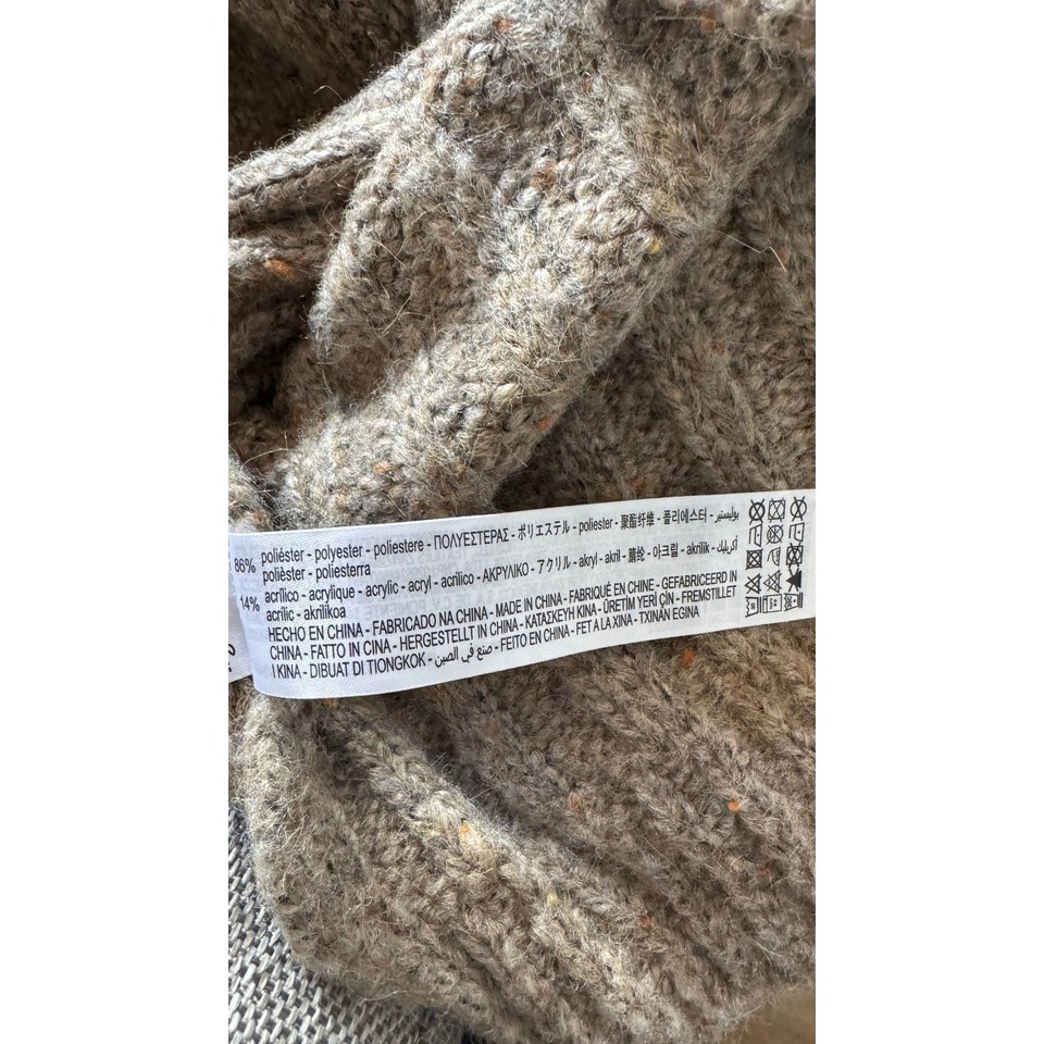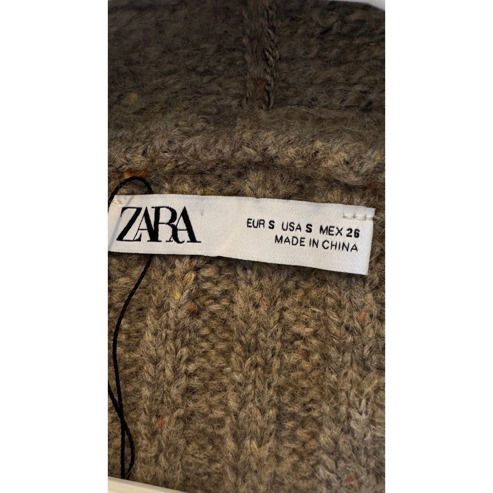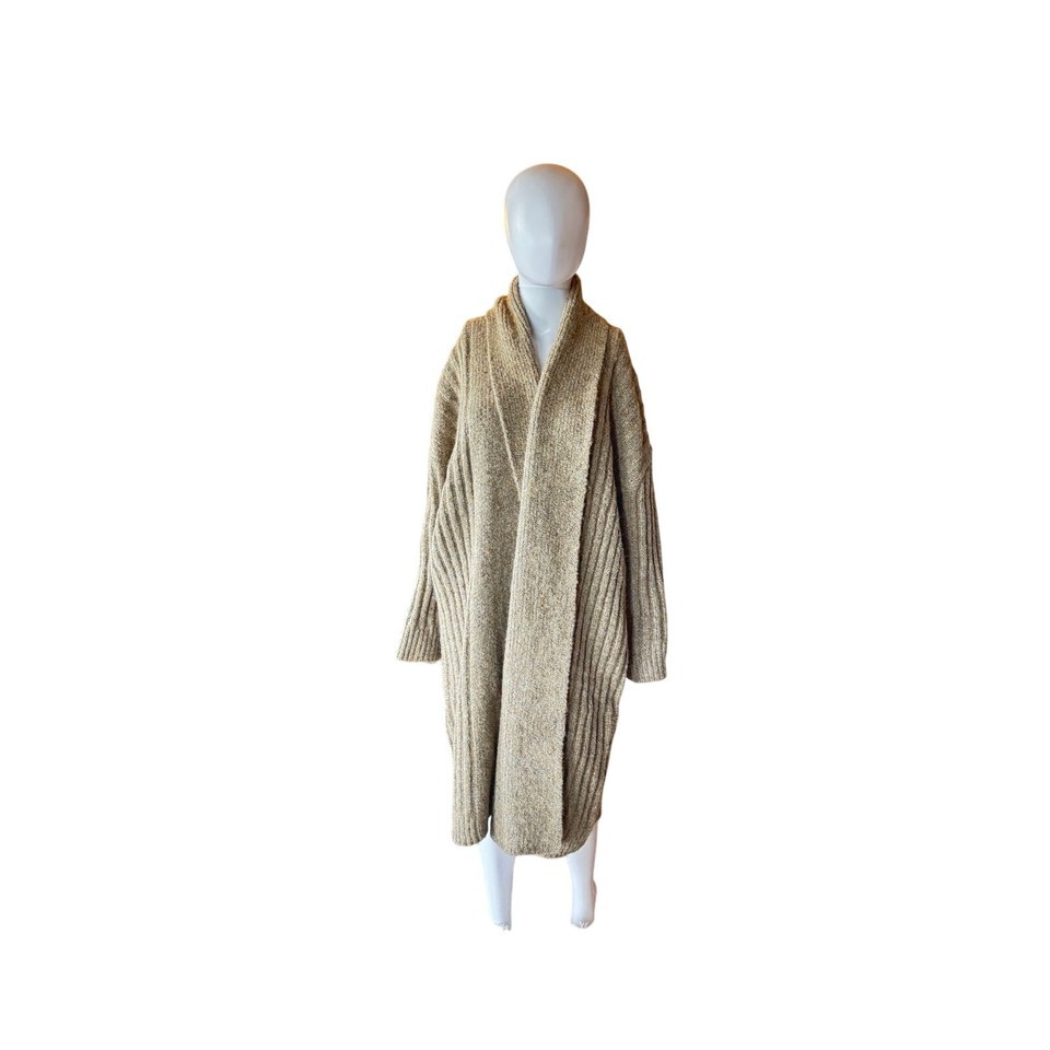Zara women?s longline cardigan sweater coat in a neutral beige/tan color. Features ribbed knit sleeves, open front, and relaxed oversized fit. Cozy layering piece perfect for fall and winter.