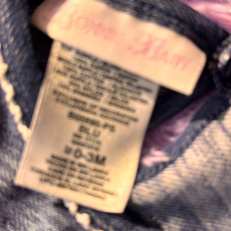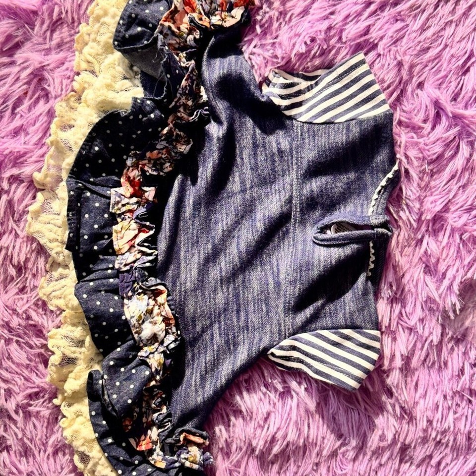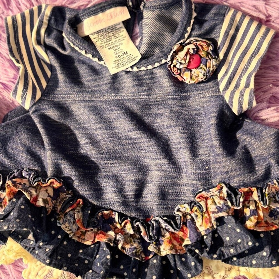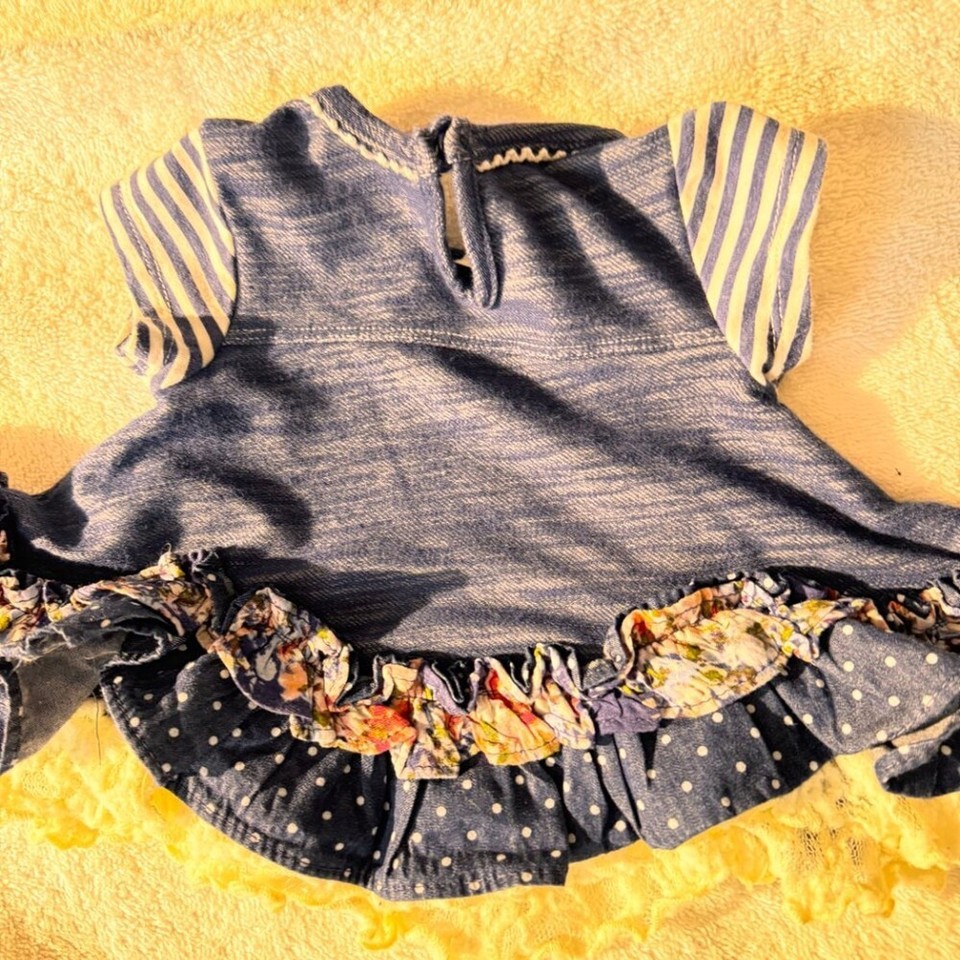 Absolutely darling baby dress with a denim-look bodice, striped sleeves, and ruffle hem with floral + polka dot layers ?? Finished with lace trim and a floral rosette. Perfect for photos, parties, or everyday cuteness!