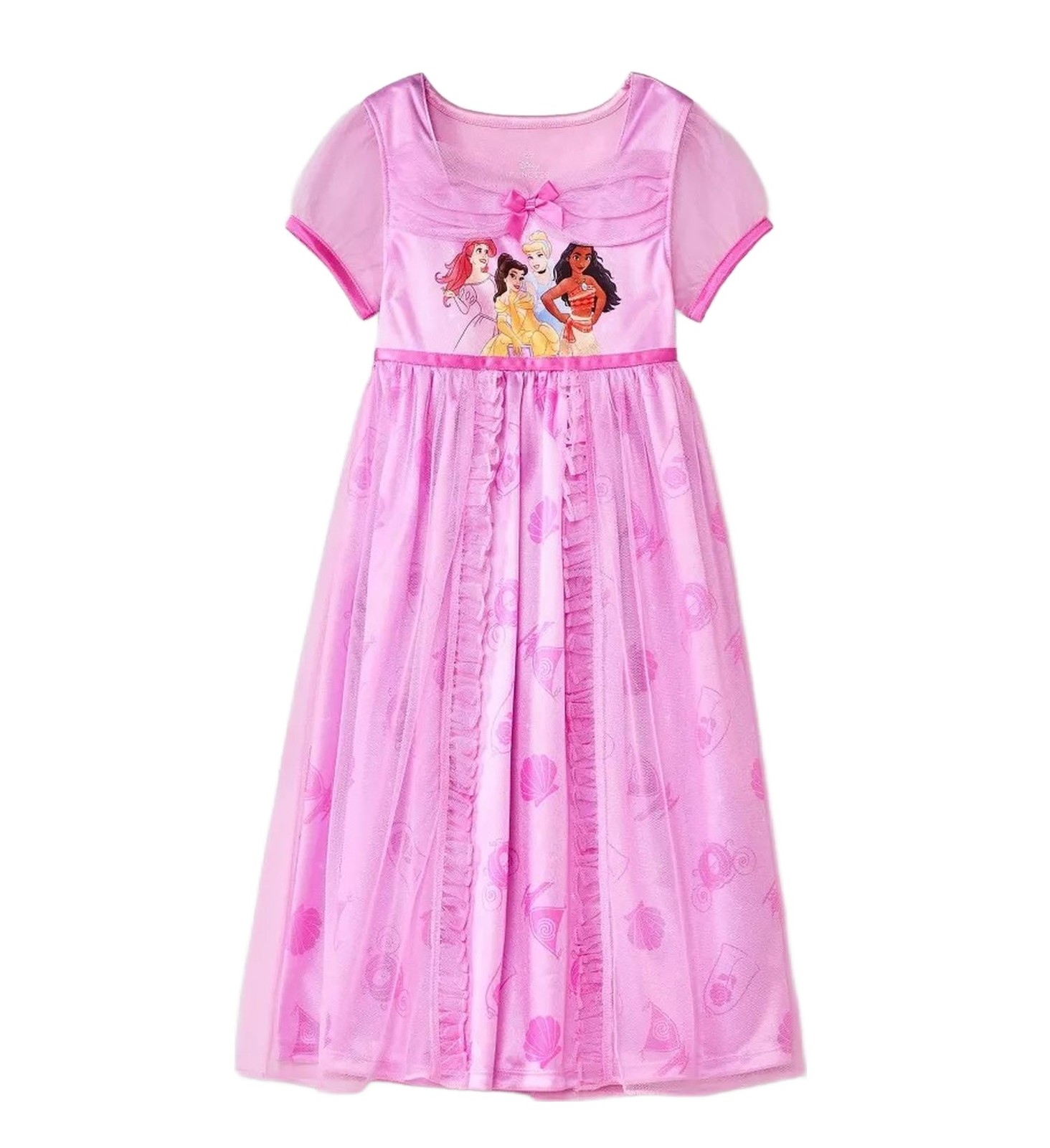 Transform her bedtime into a fairy tale with this enchanting Disney Princess Nightgown! The square neckline beautifully frames the graphic of beloved Disney princesses-Moana, Belle, Cinderella, and Ariel-making her feel like she's stepping right into her own story. The bodice features a charming tulle gathered fabric strip adorned with a lovely pink satin bow at the center, adding a touch of elegance. The skirt is adorned with an allover print of Princess-themed icons, and it has a beautiful tulle overlay with ruffles that adds elegant charm. Crafted of a silky soft satinet fabric, 100% Polyester.