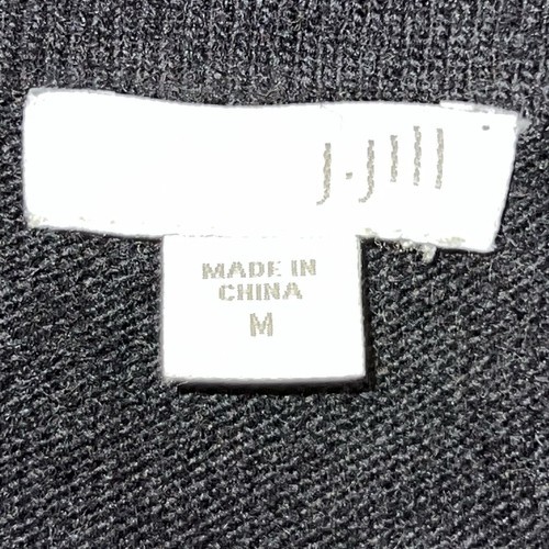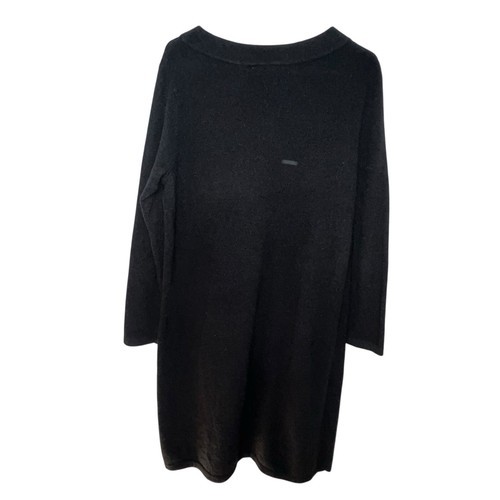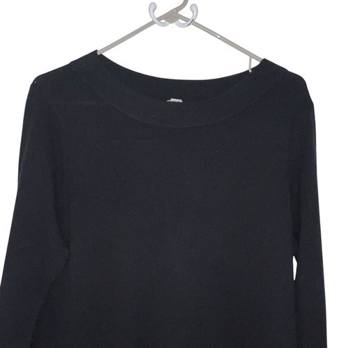 This is a black J. Jill sweater dress in size M. It is made of a wool and nylon blend with a knit fabric type. The dress has long sleeves, a crew neck, and a pullover closure. It features a knee-length shift silhouette with collarless design, stretchy material, and pockets. The style is described as classic and preppy, suitable for travel, casual outings, or business settings.