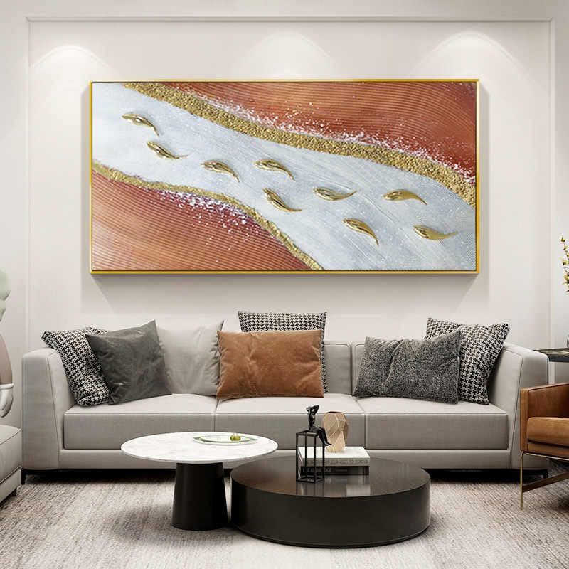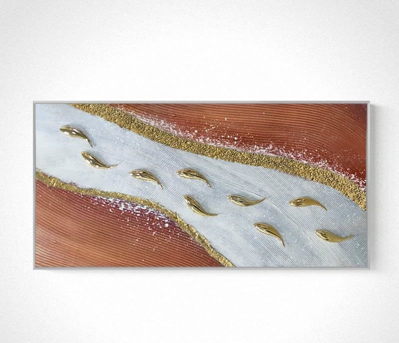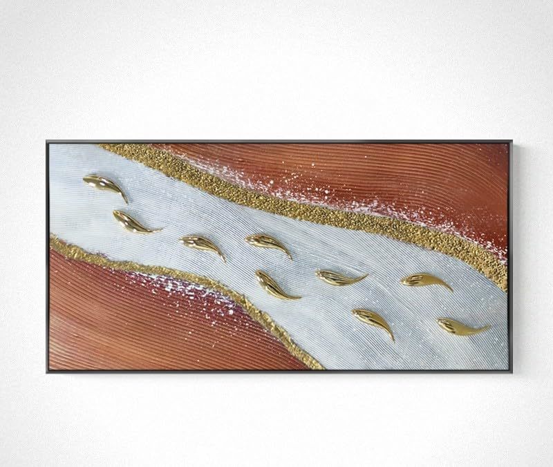 Product description: Transform your space with this stunning Nine Koi Fish luxury oil painting, a statement piece measuring 47 x 24 inches. This horizontal artwork showcases nine meticulously hand-painted golden koi swimming through textured waves and sand-like abstract backgrounds in rich red and gold tones. The painting features remarkable 3D texture with dimensional brushwork and metallic accents that catch the light from different angles. Set in a sleek black aluminum frame, this sophisticated piece brings both modern elegance and traditional symbolism to any room. The textured canvas creates a sculpture-like quality that adds depth and visual interest to living rooms, offices, or entryways. Each brushstroke highlights the artistic craftsmanship while the vibrant color palette creates a focal point that draws the eye. This Interoknack original combines artistic excellence with powerful symbolism, making it perfect for collectors and design enthusiasts seeking distinctive wall decor that makes a lasting impression.
