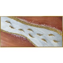 Transform your space with this stunning Nine Koi Fish luxury oil painting, a statement piece measuring 47 x 24 inches. This horizontal artwork showcases nine meticulously hand-painted golden koi swimming through textured waves and sand-like abstract backgrounds in rich red and gold tones. The painting features remarkable 3D texture with dimensional brushwork and metallic accents that catch the light from different angles. Set in a sleek black aluminum frame, this sophisticated piece brings both modern elegance and traditional symbolism to any room. The textured canvas creates a sculpture-like quality that adds depth and visual interest to living rooms, offices, or entryways. Each brushstroke highlights the artistic craftsmanship while the vibrant color palette creates a focal point that draws the eye. This Interoknack original combines artistic excellence with powerful symbolism, making it perfect for collectors and design enthusiasts seeking distinctive wall decor that makes a lasting impression.