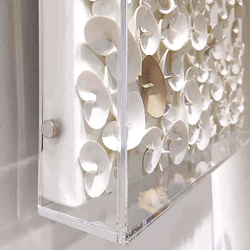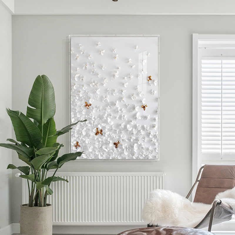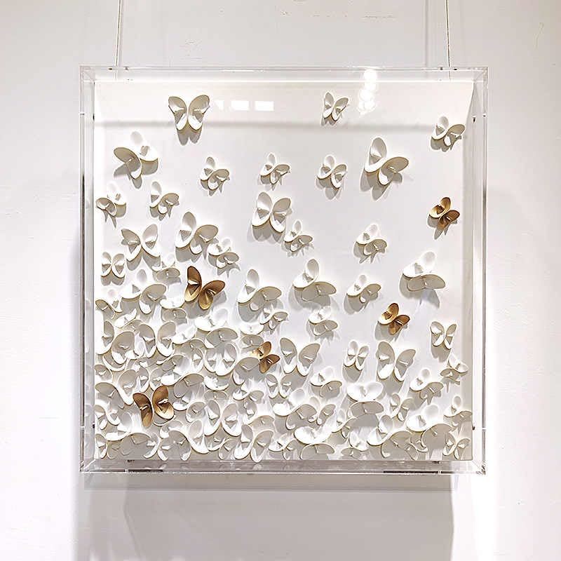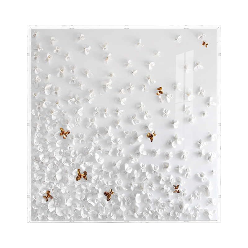 Product description: Transform your living space with this exquisite Modern Light-Luxury 3D Leather Butterfly Wall Art by Interoknack. This stunning 80 x 80 cm (31 x 31 inches) statement piece features dozens of meticulously hand-shaped white leather butterflies with elegant gold accents that create a sense of movement and sophisticated dimension. Encased in a crystal-clear acrylic box, the artwork achieves remarkable visual depth and casts captivating shadows across your walls. The generous square format makes it a perfect focal point for contemporary living rooms, entryways, above headboards, or in dressing areas. Each butterfly is carefully crafted with premium leather materials, showcasing exceptional handmade artistry with soft tactile textures. This Dancing Butterflies theme brings lightness, elegance, and poetic charm to any space, particularly complementing French-modern and luxury interior designs. Make a refined artistic statement with this high-end decorative masterpiece that elevates your home's aesthetic.