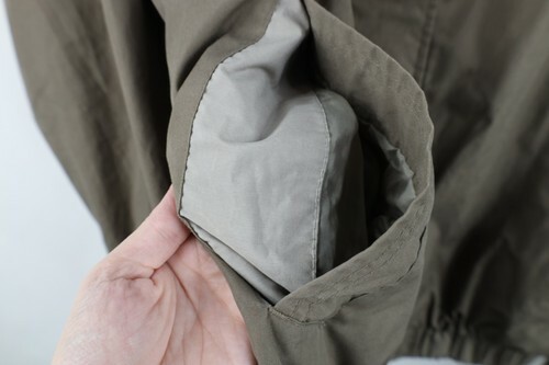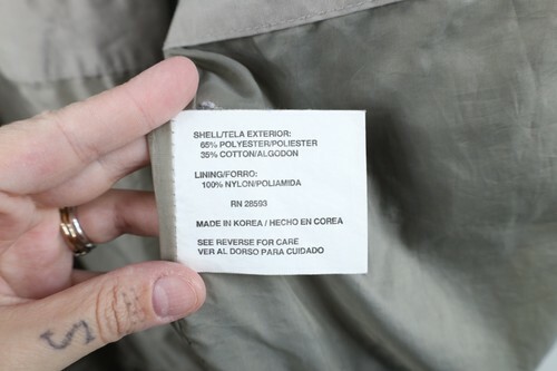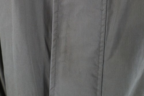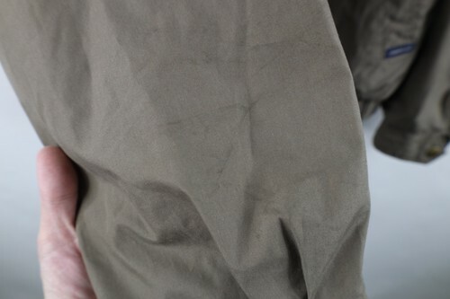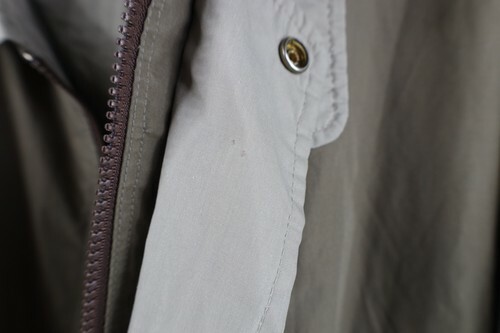 Stains/dark spots throughout, and inner lining. Hole, loose threads along inner right seam. Loose threads, discoloring inner lining. Collar, cuffs discolored. Color faded. Loose threads pockets. Buttons tarnished