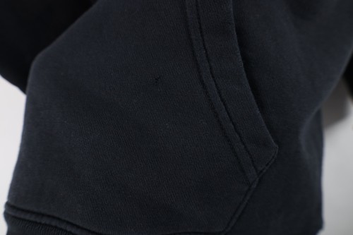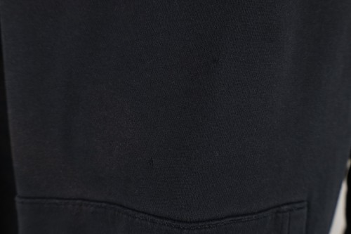 Holes front, pocket, cuffs, bottom hem, string. Bleach stains front. Blemishes, dark spots throughout. Hood, cuffs discolored. Graphics, color faded. String distressed