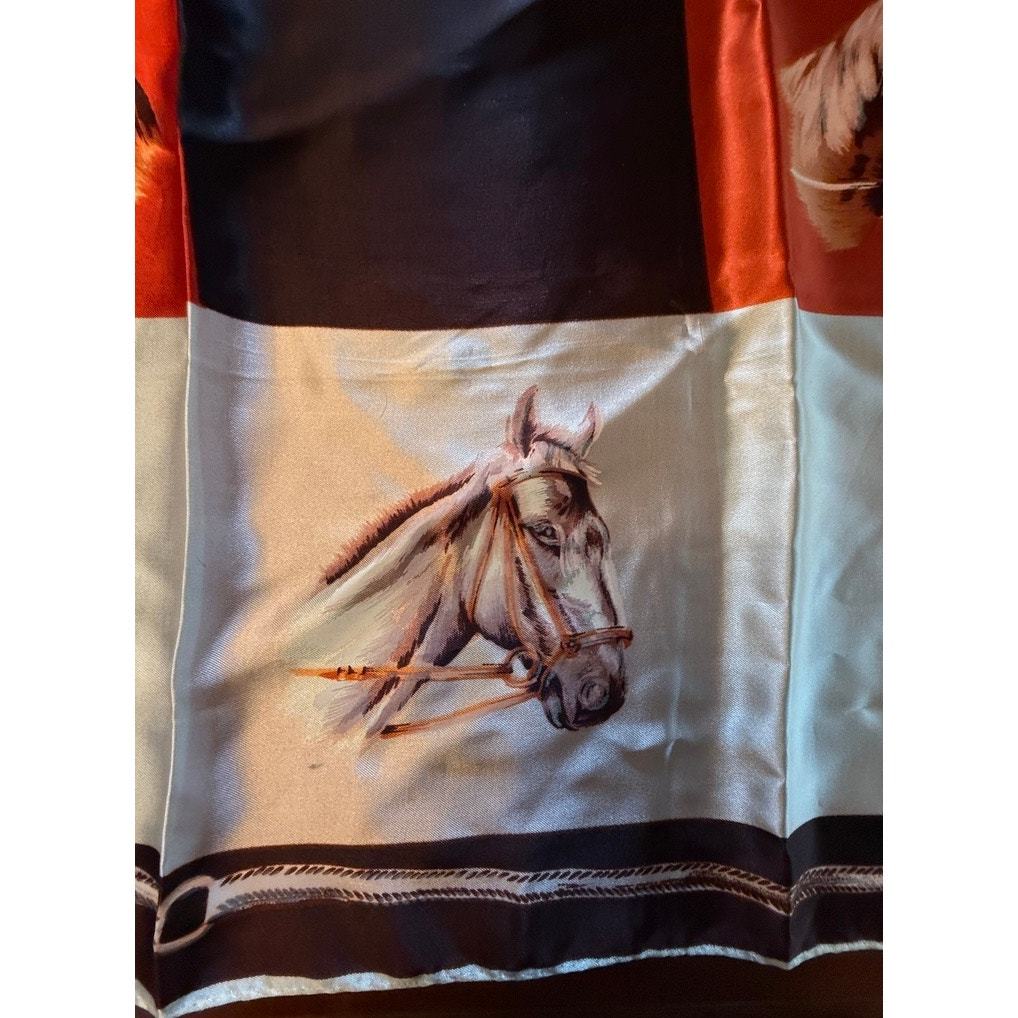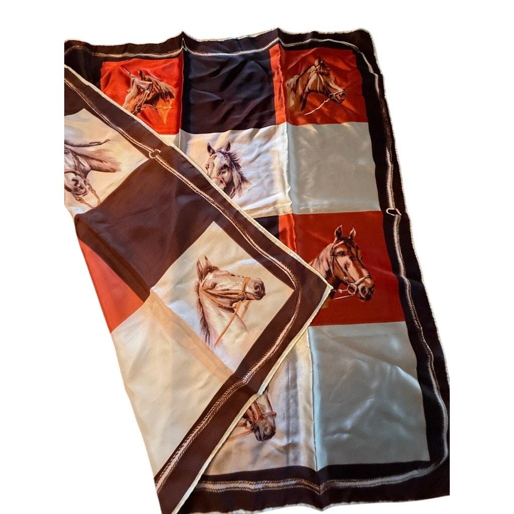 Beautiful 1940s?50s vintage ?Portrait of Horses? scarf, attributed to McFrango (France) ? unsigned, as was typical of the era. Made of polyester satin with rich autumn-toned horse illustrations arranged in a large checkerboard layout. Features hand-rolled edges and measures a generous 31-inch square. A stunning piece to wear, display, or frame.